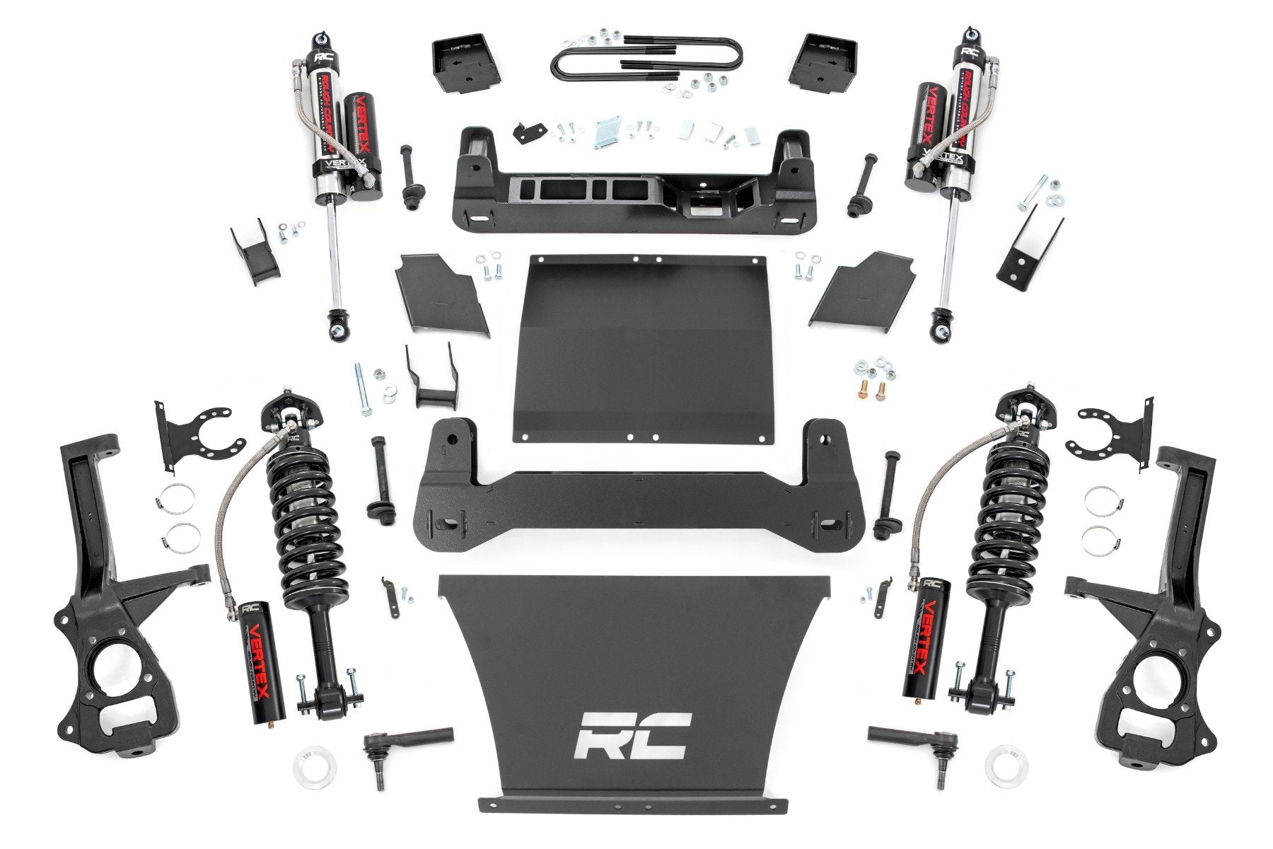 Explore New Heights: Chevy's fourth generation 1500 features an impressive all-new design that's built from the ground up, with aggressive angles and head-turning stylings that fit in beautifully when transformed with Rough Country's 6-inch Suspension Lift.Innovative Design and Construction: When changing a vehicle's suspension, the key to preserving ride quality is keeping the geometry of all suspension components as close to their factory angles as possible.This suspension kit combines the use of durable steel knuckles, differential brackets, and drop cross members to reduce cv angles and simulate factory angles all while achieving new heights. Featuring a set of upper strut spacers that offer uncompromised strength and rigidity, gaining lift height is no issue. Completing the rear of this suspension kit is a set of rear blocks, shocks, and u-bolts that allow you to retain factory-like geometry. This combined setup provides enough clearance to run 35" tires without additional modifications. We didn't want to limit you to one standard kit. Rough Country's 6-inch kit is configurable with all the shock options that we offer. This allows you to choose which shock series you want! Ranging from our nitrogen-charged N3 shocks to our Vertex reservoir shocks the power to choose is in your hands.Installation: With minor cutting and a strut compressor required to install, an estimated timeframe of 8-10 hours is recommended to complete this full installation. This full kit can be installed at home and can be completed efficiently and quickly!Limited Lifetime Replacement Warranty: Rough Country's 6" Suspension Lift Kit is backed with a limited lifetime replacement warranty towards manufacturer defects. As such, the product is protected from structural and workmanship damage after the date of purchase. With our industry-leading warranty give yourself peace of mind when using Rough Country's Suspension products!