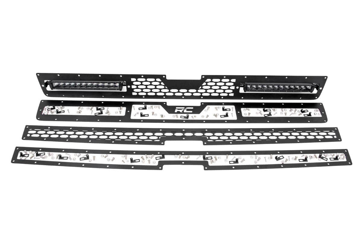 Give the front-end of your Chevy 2500 or 3500 a unique look with Rough CountryΓÇÖs Mesh Grille kit! This grille replacement kit swaps out your stock grille with the eye-catching, head-turning good looks of this aftermarket upgrade. With a unique, laser-cut mesh pattern surrounded by stylish, stainless steel button head bolts, this grille gives your truck a more menacing look thatΓÇÖs sure to draw attention. Each kit is powder-coated black to resist corrosion and give a long lifespan of good looks.\\This kit features two of Rough Country's 12in Single-Row Black-Series LED light bars with Cree LED's outputting a staggering 9,600 Lumens and 120 Watts of lighting power. Includes a mountable on/off switch, wiring harness, and our 3 Year Warranty!