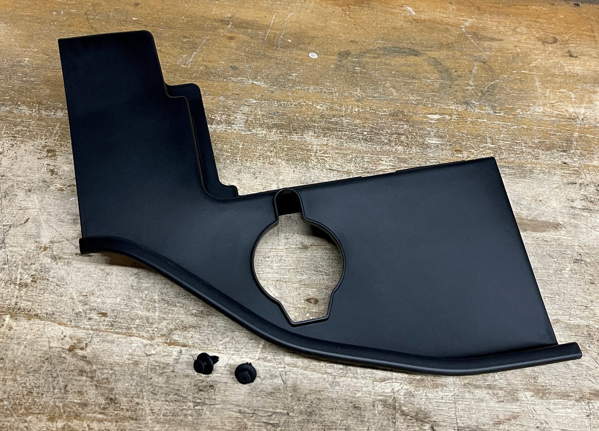 Note: If you have a cable across the front of your fuse box, you will need to disconnect it from the push pin bar and move it down and out of the way, then affix this cover to the push pin bar.  See photos.