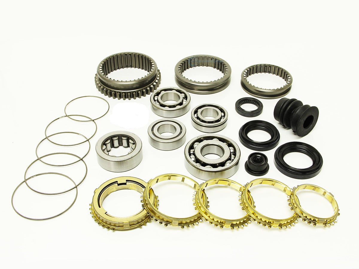 Included: 1-5 Brass Synchros, 1-5 synchro springs, brass reverse synchro and spring, 1-5 Slider Sleeves, 5 shaft bearings, 2 axle seals, input seal, shift rod seal, and a new dust boot.