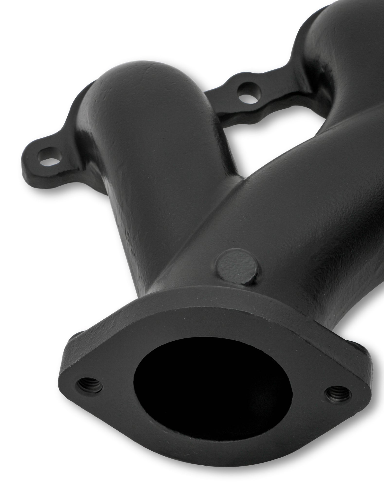 These Hooker BlackHeart cast iron exhaust manifolds have a 2.50 inch outlet, black ceramic finish and are designed to hug close to the engine block so they fit into a wide variety of replacement and engine-swap applications. Their contoured design aims the exhaust directly toward the exit port for improved flow. Being cast iron means they will provide years of leak-free performance with less under hood noise than traditional headers. Plus, their shorty design means you can route exhaust tubing close to your frame/floor pan for maximum ground clearance.