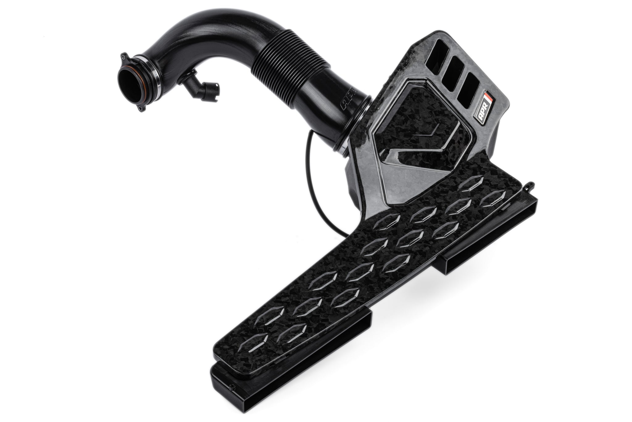 The APR Intake System is sold as an open system but can be configured as a closed system design by adding this cover. This cover is made from Carbon Fiber with a forged pattern and snaps into place without the need for any tools. Additional airflow paths allow the system to pull additional air on high power setups, while also allowing more turbocharger sound.