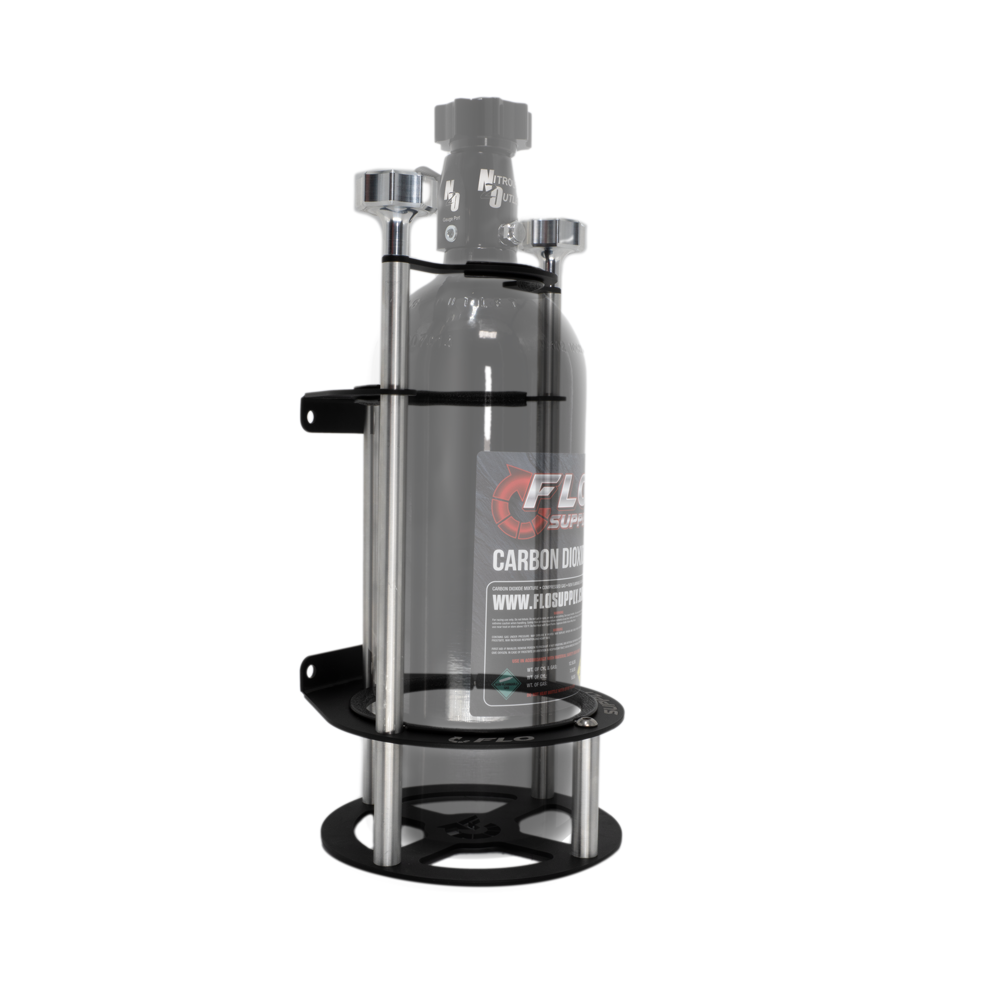 The Race-Light Bottle Bracket series is designed to provide a light weight, ridged mounting option for aluminum 5lb C02 Bottles. The Race-Light Bottle brackets are constructed of light-weight powder coated aluminum, 6061 Billet aluminum, and stainless-steel fasteners with a flexible edge trim to protect the bottle from scratches. These brackets are meant to be mounted vertically in your application.