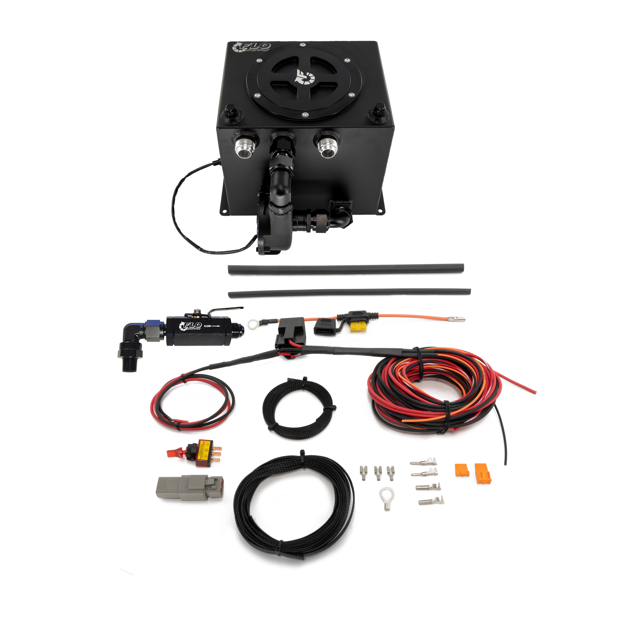 The Flo Supply Ice Water Circulation Tank System offers an effective solution for dissipating heat and lowering air intake temperatures in boosted applications. The Billet Drain Valve allows for quick drainage of the water, making room for additional ice.