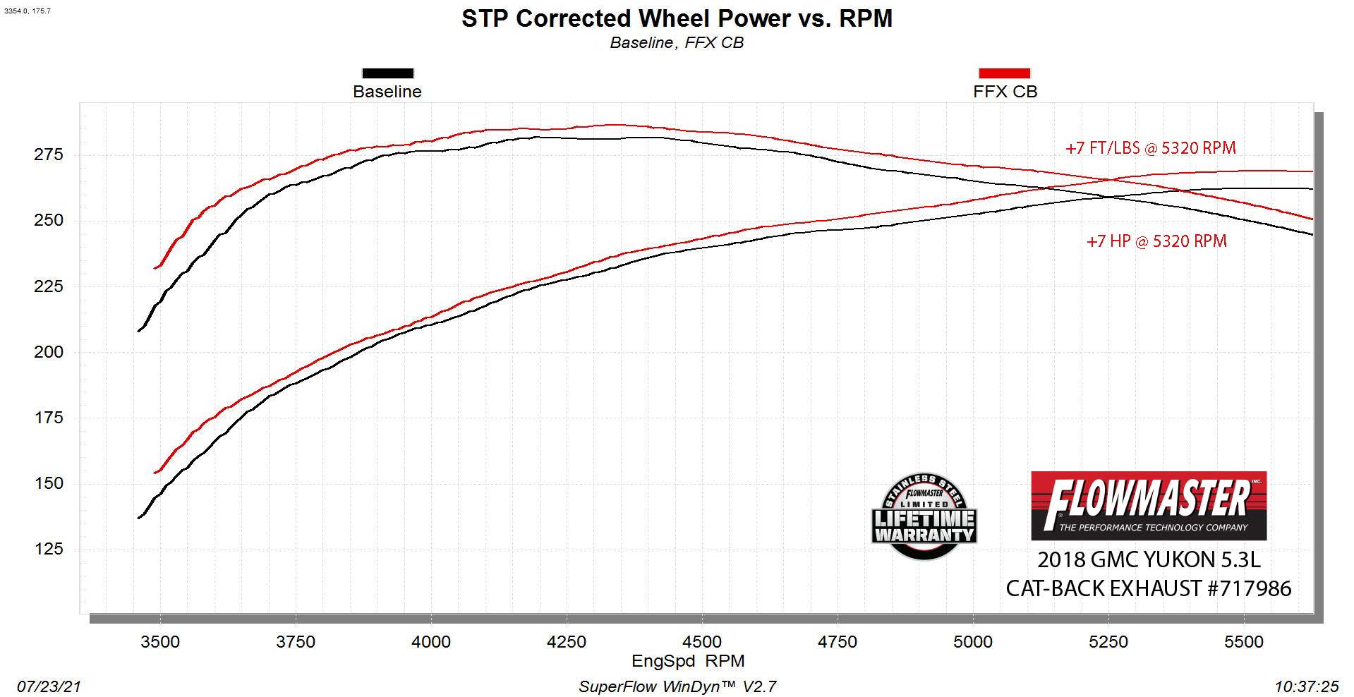 This Flowmaster® Flow FX® cat-back exhaust system for the 2015-2020 Chevrolet Tahoe and GMC Yukon with the 5.3-liter engine is manufactured using durable 409 stainless steel throughout and features 3.00-inch to dual 2.50-inch mandrel bent pipes for better exhaust gas flow. This system exits out the side with dual 3.50-inch black stainless steel tips for added style and a custom look. Max dyno gains of 7 hp and 7 lb-ft of torque over stock at the rear wheels. The system uses all the existing factory hanger locations and includes installation instructions and all necessary hardware for an easy installation that you can do at home. Backed by Flowmaster's Lifetime Limited Warranty.