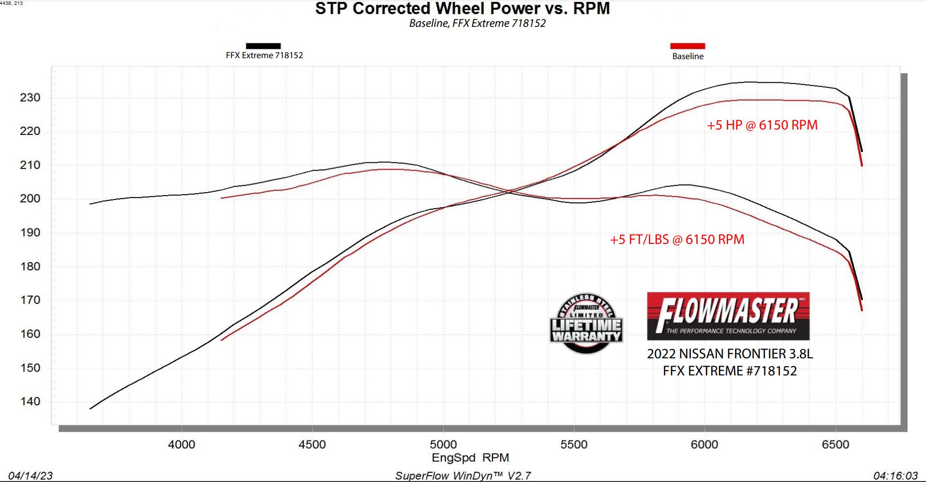 This Flowmaster Flow FX Extreme stainless-steel cat-back exhaust system for the 2022-2025 Nissan Frontier with the 3.8-liter engine. This system uses a Flow FX series muffler for a deep powerful sound and increased performance. 2.50 and 3.00-inch mandrel bent 409 stainless steel tubing is used for maximum exhaust flow and durability. Gain up to 5 hp and 5 lb-ft of torque at the rear wheels over stock. The system has a turndown style dump exit right after the muffler to eliminate the over-axle tailpipe. This elimination of the tailpipe helps to improve ground clearance and departure angle when you are driving in more extreme off-road situations. All of the necessary hardware is included and factory-mounting locations are used for an easy installation. Backed by Flowmaster's Lifetime Limited Warranty.