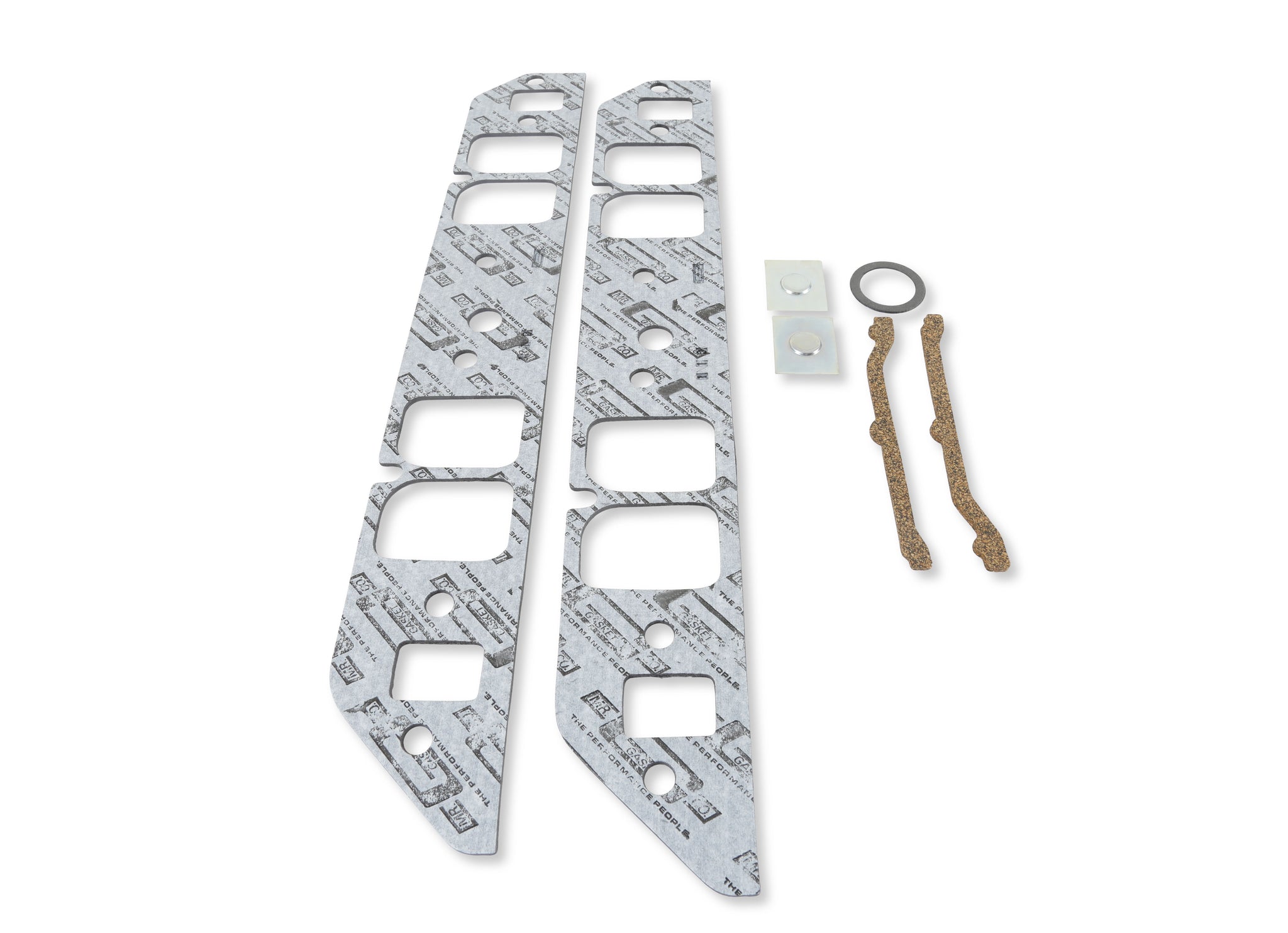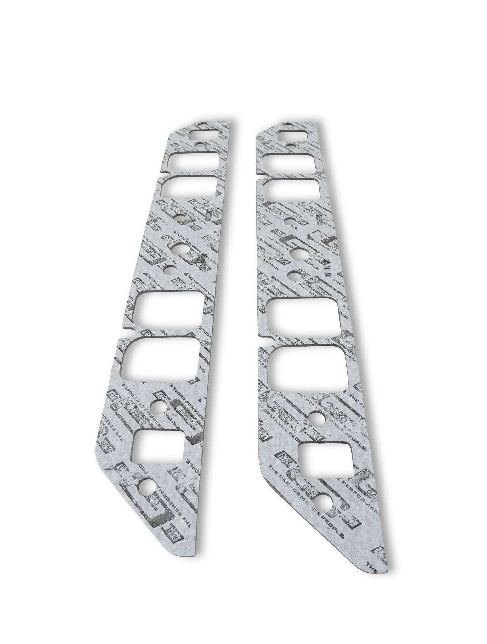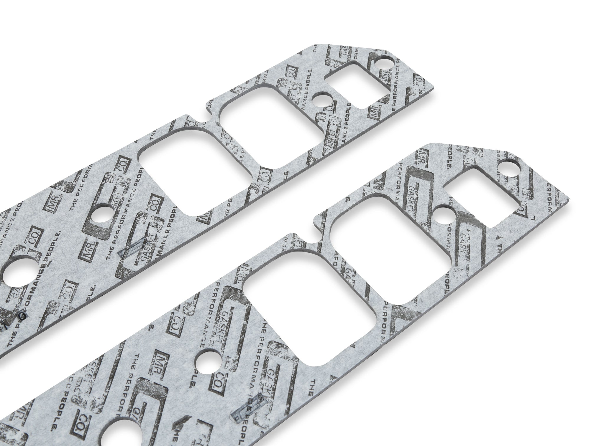 Mr. Gasket Performance Intake Gaskets are manufactured from cellulose/nitrile composition gasket material. This is a low density material that conforms well to irregular surfaces and has very good crush resistance at high flange pressures. They provide excellent sealing and durability as the material is designed for sealing gasoline, oils, water and coolant in applications up to 350 degrees Fahrenheit. While die-cut for an excellent fit, they can be trimmed if necessary for modified port applications. Comes complete with front & rear manifold end seals. For original equipment replacement, high performance street, drag race and oval track.