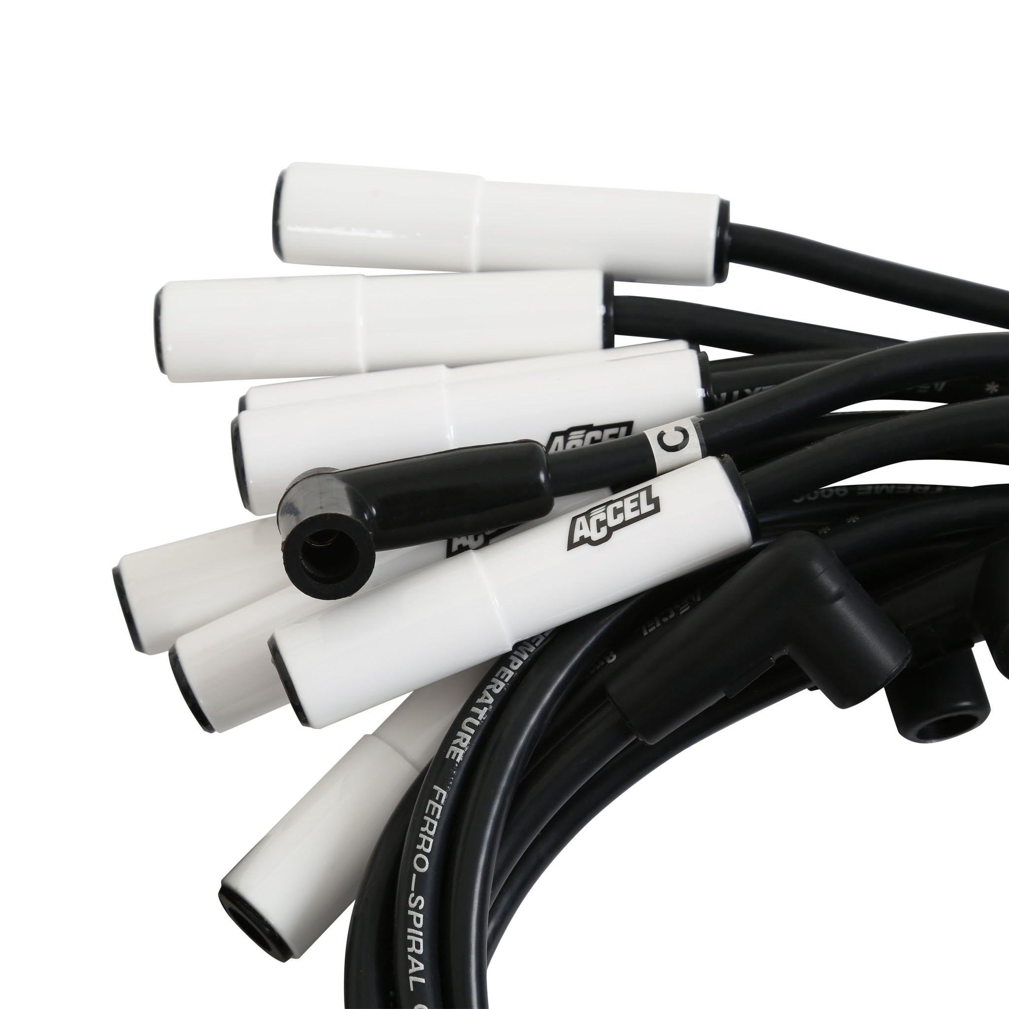 ACCEL now offers the cure for burnt spark plug boots with Extreme 9000 Ceramic wire kits. The 8mm Ferro-Spiral core wire now has ceramic boots on the spark plug end of the wires. Ceramic boots withstand up to 2,000 degrees. Great for running headers with close tolerances, an engine bay with little room, or an RV with boots that melt because of heat. Ultra high temperature double silicone construction wire rated at 600 degrees fahrenheit peak. 500 ohms/ft Ferro-Spiral core developed for performance use. Excellent energy delivery to the spark plugs, while providing the highest level of RFI/EMI suppression. Stainless steel spark plug terminals for maximum spark energy to the plugs. Pre-made to factory lengths for a perfect fit.