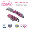 Steel Construction with a Light-Weight Frame. Our new pink foldable utility knife combines strength and durability with multi-use. Sleek, ergonomic, lightweight, the knife features an easy blade switch mechanism, a carabiner clip and a hook. It comes in an attractive metallic pink hue and with Apollo Tools’ lifetime warranty. Click on this link to register your Apollo Tools product.