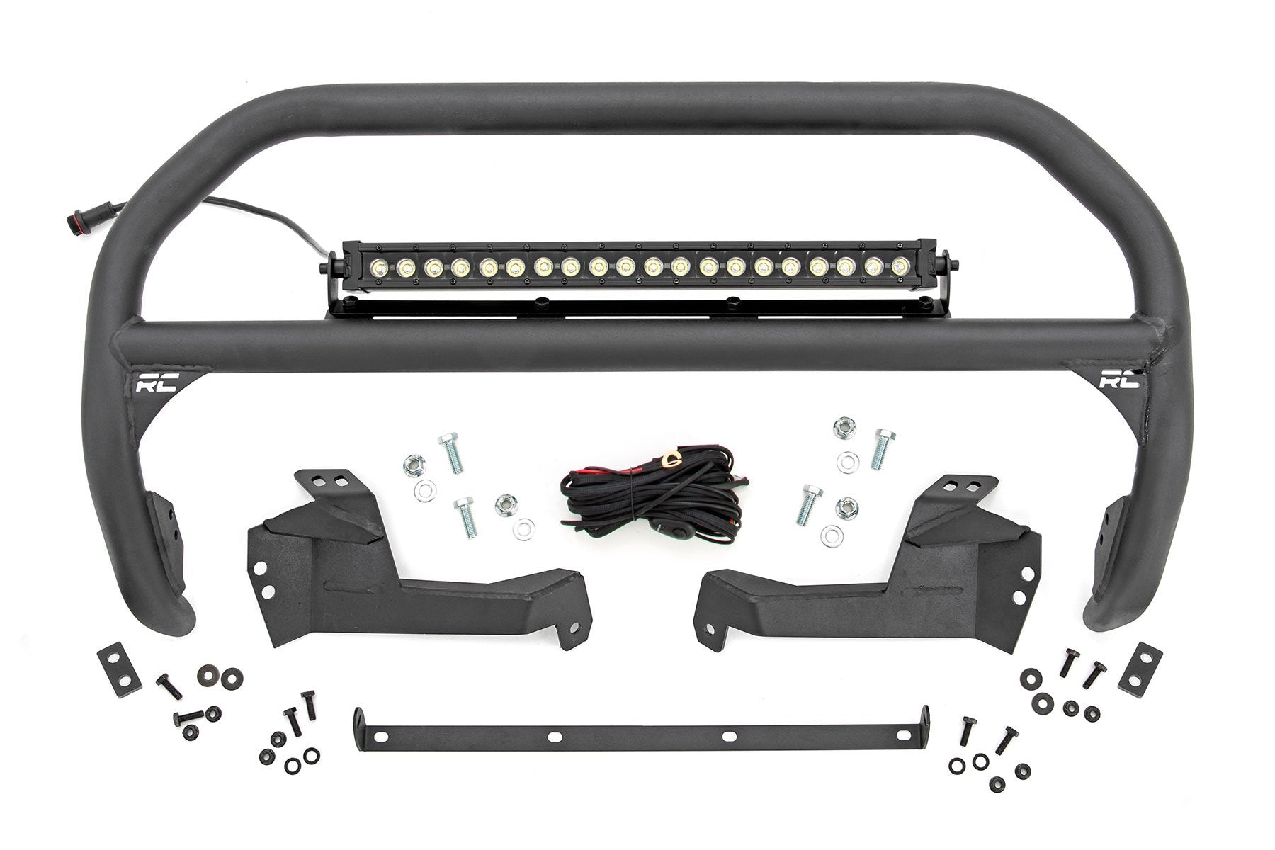 Outfit your 2021 Bronco Sport right with Rough Country's Nudge bar. This durable 3-inch thick tubular steel bull bar provides unbeatable protection for the front side of your vehicle all while offering multipe LED mounting solutions to provide ample lighting for the trail ahead.\ \This easy-to-install bull bar features a 100% bolt-on installation process, giving you a simple way to add this eye-catching upgrade that provides protection from hazards on and off-road. Each Nudge Bar is coated with corrosion-resistant black powder coat to ensure a long-lifespan for years to come.\ \Rough Country's Nudge Bar can be equipped with four round LED lights, or a single row 20" LED light bar! Rough Country’s all-weather LED lights feature a durable, die-cast aluminum housing and include a premium, waterproof, flat-wound, braided wiring harness with toggle switch and in-line fuse.