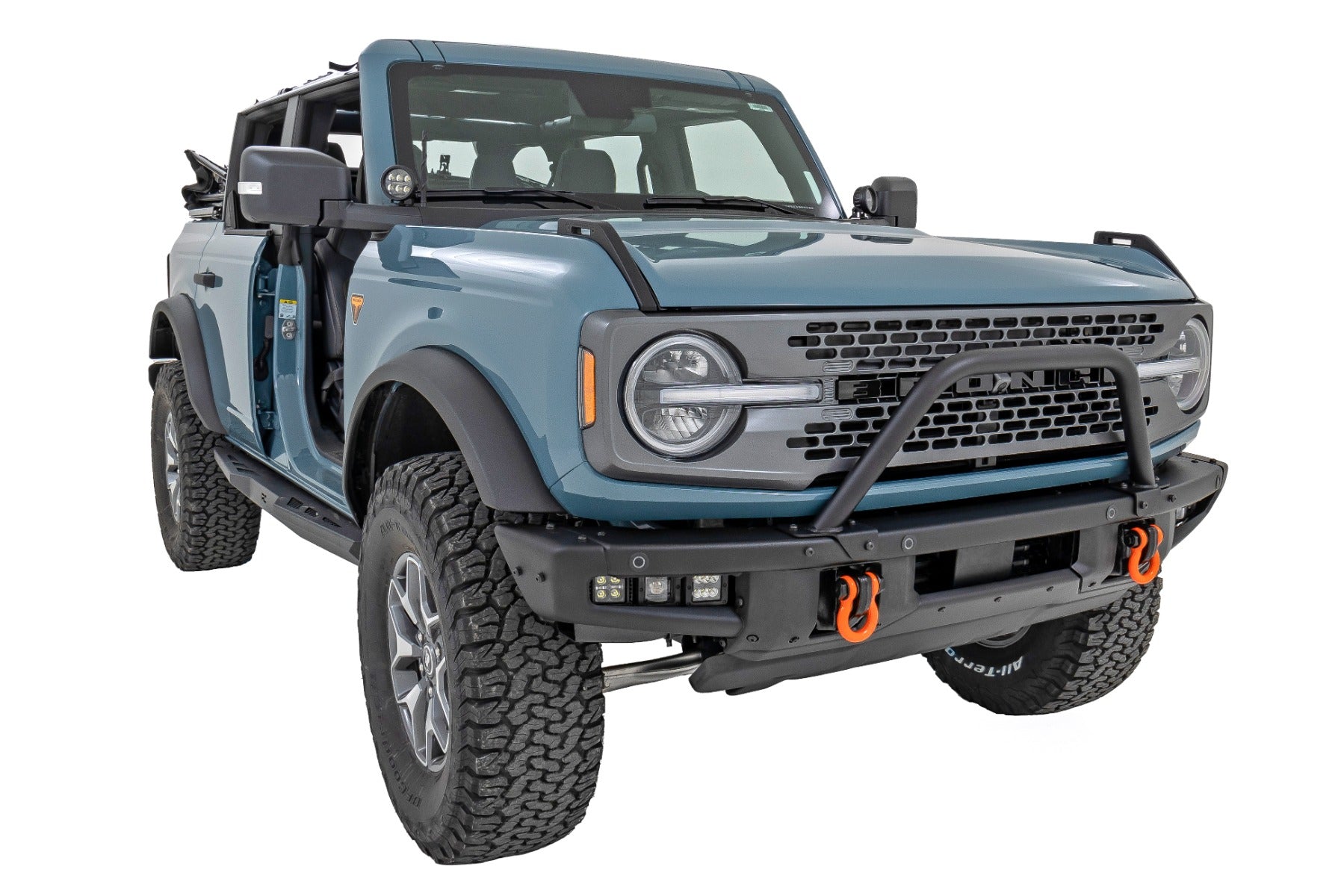 Rugged Style and Protection. Create a custom front-end look with the Rough Country Bronco Safari Bar. Rough Country's Bronco Safari Bar is just what you need. Offering protection from both on and off-road hazards, it's perfect for tackling any adventure. Plus, with multiple LED mounting solutions, you can be sure you'll have plenty of light - no matter where you go. And if you're looking to add a winch, the Safari Bar works perfectly with Rough Country's High Mount Winch Kit. This is the perfect accessory for off-roading enthusiasts who strive to go farther and higher every time they hit the trails.\Built to Withstand. The Rough Country Bronco Safari Bar is the perfect accessory if you're looking to get your Bronco ready for an adventure. This tough bar is made from high-quality steel with 1 7/8" x .095" wall tubing to ensure maximum strength. The mounting flanges are also made from 7-gauge material, so you know it's built to last. In addition, it comes in a corrosion-resistant black powder coat finish to withstand even the most challenging terrain. Rough Country's Bronco Safari Bar is a perfect choice if you're tackling rugged trails or just want to add a little extra style to your ride.\Installation and Warranty. This easy-to-install bar is perfect for anyone looking to take their Bronco to the next level. The Safari Bar mounts directly to your modular bumper using factory hardware and can be installed as a stand-alone unit. You also get peace of mind knowing that your purchase comes with a limited lifetime replacement warranty for manufacturer defects. With Rough Country's industry-leading warranty, you can be sure that your Rough Country lift kit is protected from structural and workmanship damage after purchase.