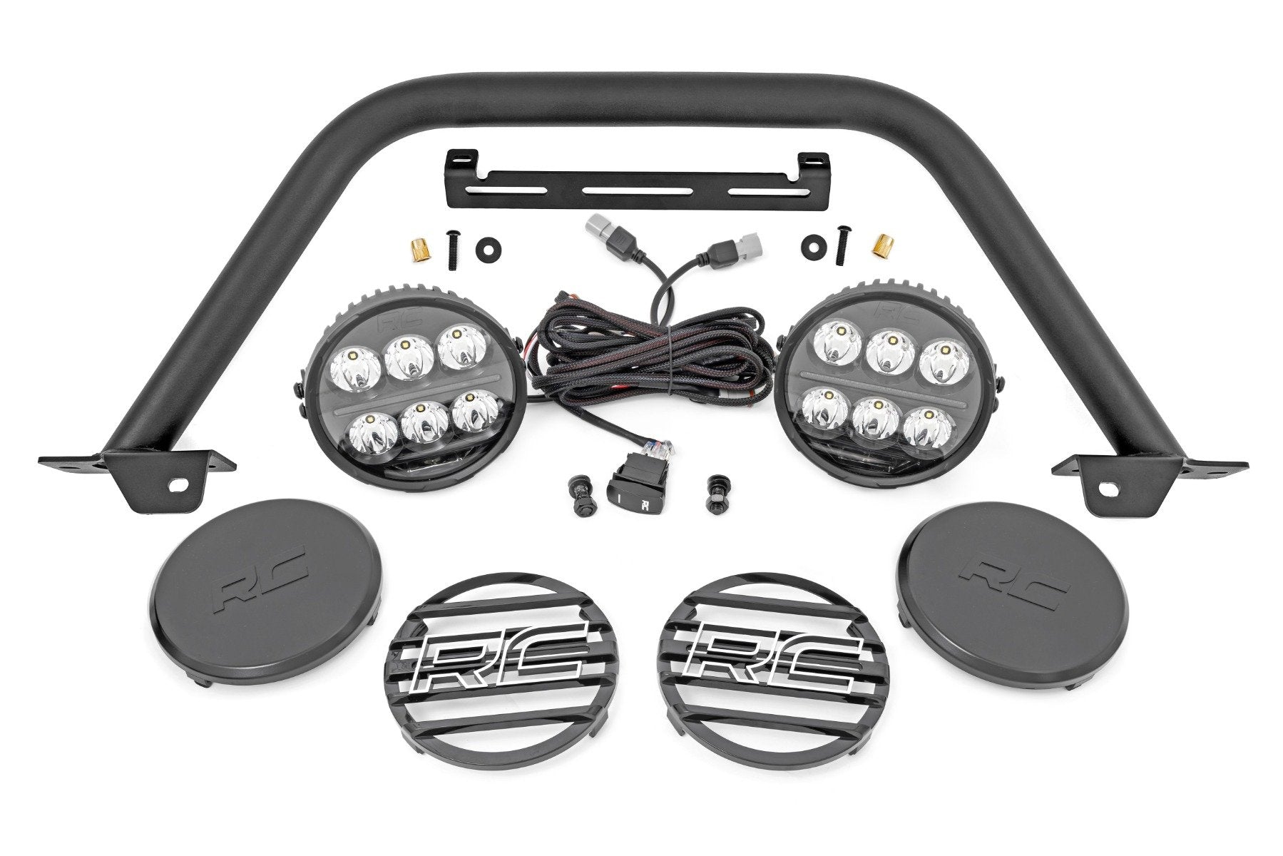Rugged Style and Protection. Create a custom front-end look with the Rough Country Bronco Safari Bar. Rough Country's Bronco Safari Bar is just what you need. Offering protection from both on and off-road hazards, it's perfect for tackling any adventure. Plus, with multiple LED mounting solutions, you can be sure you'll have plenty of light - no matter where you go. And if you're looking to add a winch, the Safari Bar works perfectly with Rough Country's High Mount Winch Kit. This is the perfect accessory for off-roading enthusiasts who strive to go farther and higher every time they hit the trails.\Built to Withstand. The Rough Country Bronco Safari Bar is the perfect accessory if you're looking to get your Bronco ready for an adventure. This tough bar is made from high-quality steel with 1 7/8" x .095" wall tubing to ensure maximum strength. The mounting flanges are also made from 7-gauge material, so you know it's built to last. In addition, it comes in a corrosion-resistant black powder coat finish to withstand even the most challenging terrain. Rough Country's Bronco Safari Bar is a perfect choice if you're tackling rugged trails or just want to add a little extra style to your ride.\Installation and Warranty. This easy-to-install bar is perfect for anyone looking to take their Bronco to the next level. The Safari Bar mounts directly to your modular bumper using factory hardware and can be installed as a stand-alone unit. You also get peace of mind knowing that your purchase comes with a limited lifetime replacement warranty for manufacturer defects. With Rough Country's industry-leading warranty, you can be sure that your Rough Country lift kit is protected from structural and workmanship damage after purchase.