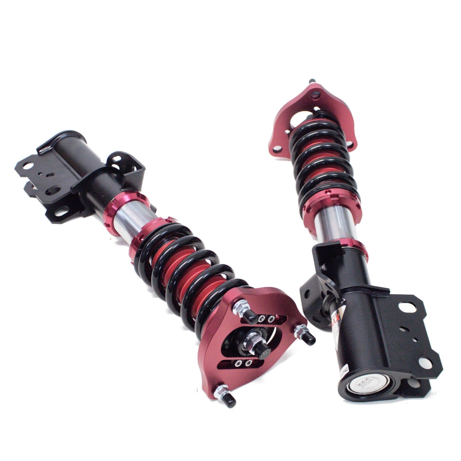 The Godspeed Project MAXX coilovers are for the tuners that want a track oriented setup that also provides daily commute comfort. With 40 levels of damping valve adjustment, you can easily adjust from stiff to soft simply by twisting the knob. Featuring mono-tube design with large capacity 52 mm dia. JIS seamless carbon steel shock body filled with IP F.A. 5W damper oil with properly valved 44 mm internal pistons to endurance competitiveness on a track course or daily spirited driving on public road. Cold wound springs are made from high tensile SAE9252 steel to ensure durability. Vehicle ride heights are adjusted with lower brackets to offer maximum shock travel in order to provide comfort compared to lowering springs alone. Mostly billet aluminum hardware accessories are used for its weight saving property in order to reduced overall weight of the coil-over system yet remain durable. All parts are replaceable and most importantly shock absorbers can be rebuild for customization or simply purchase replacement cartridge without spending too much for complete new coil-over system. You will experience quicker response times, improved bump absorption and increase grip to increase the safety when pushing your car to the limit!Improved Springs Rate To Help Ride Handling And Response