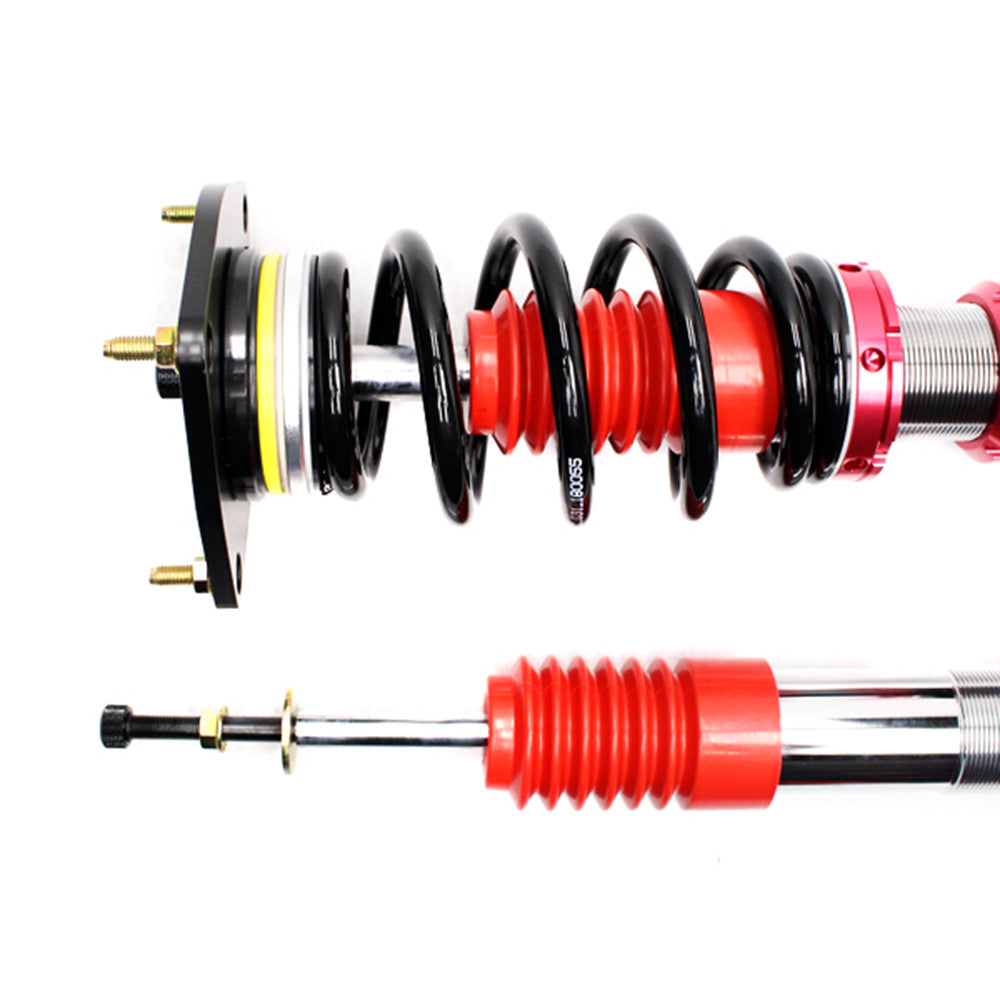 The Godspeed Project MAXX coilovers are for the tuners that want a track oriented setup that also provides daily commute comfort. With 40 levels of damping valve adjustment, you can easily adjust from stiff to soft simply by twisting the knob. Featuring mono-tube design with large capacity 52 mm dia. JIS seamless carbon steel shock body filled with IP F.A. 5W damper oil with properly valved 44 mm internal pistons to endurance competitiveness on a track course or daily spirited driving on public road. Cold wound springs are made from high tensile SAE9252 steel to ensure durability. Vehicle ride heights are adjusted with lower brackets to offer maximum shock travel in order to provide comfort compared to lowering springs alone. Mostly billet aluminum hardware accessories are used for its weight saving property in order to reduced overall weight of the coil-over system yet remain durable. All parts are replaceable and most importantly shock absorbers can be rebuild for customization or simply purchase replacement cartridge without spending too much for complete new coil-over system. You will experience quicker response times, improved bump absorption and increase grip to increase the safety when pushing your car to the limit!Improved Springs Rate To Help Ride Handling And Response