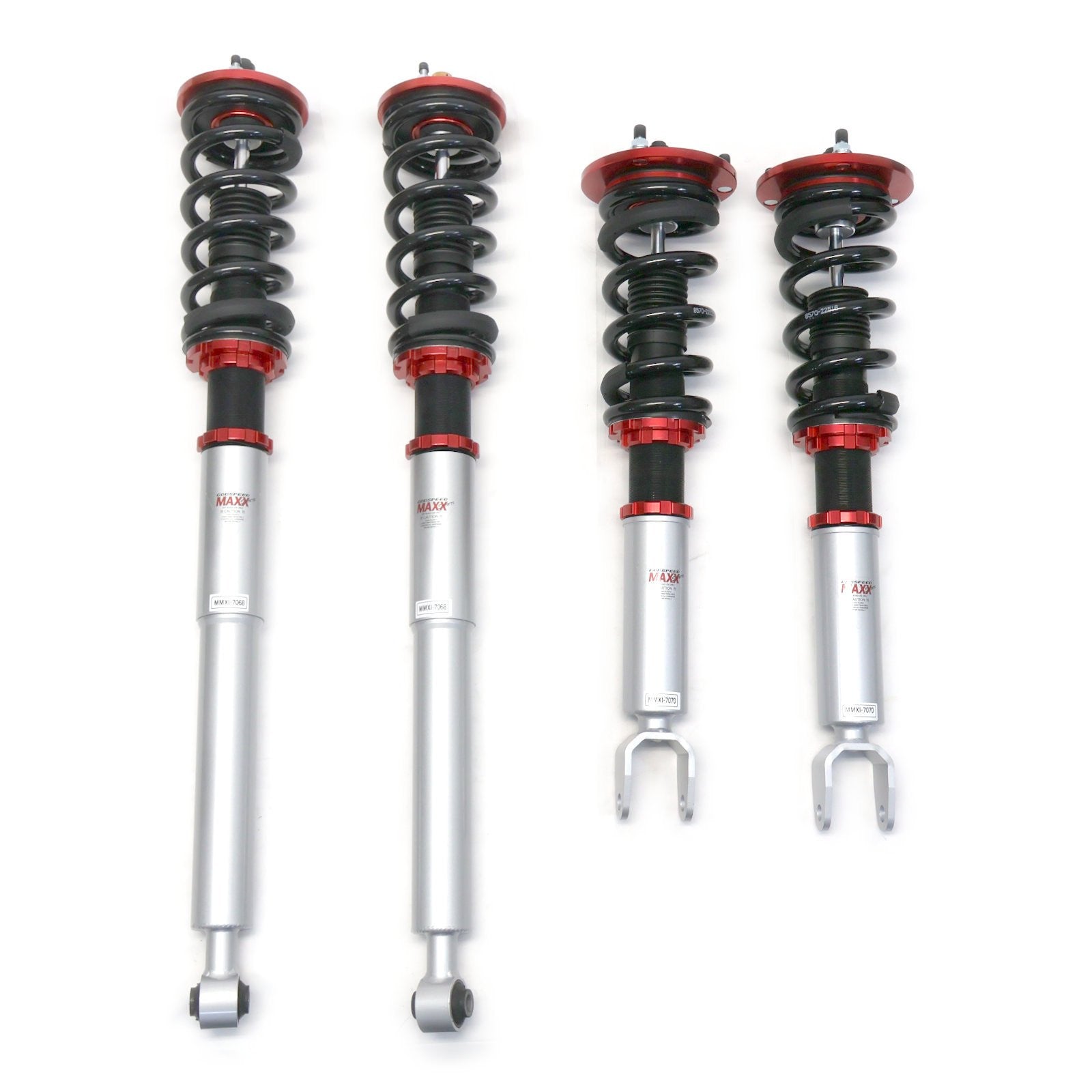 Godspeed Project's MAXX Sports line is engineered to be a more track-oriented coil-over system. Utilized "Inverted" mono-tube shocks to replace where MacPherson struts are used for better rigidity. All mono-tube shocks are finished with anti-corrosion coating and special valving that allows 20-level adjustments to control the rebound damping force. Pillow ball top mounts on four corners provide a far more precise feel from the suspension and steering. High-rigidity steel coil springs provide more control and quick steering to improve the vehicle's overall handling. Aluminum hardware is used where applicable to reduce overall weight.