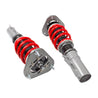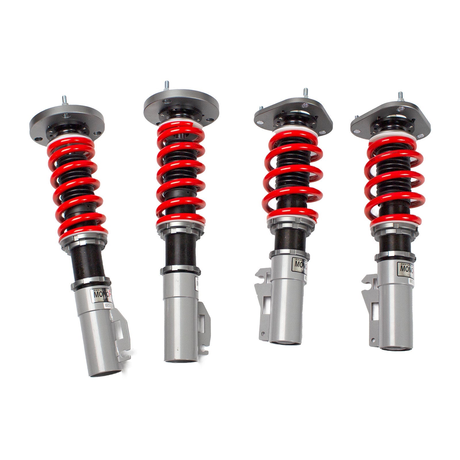 MonoRS Coilover damper kit by Godspeed Project are an intermediate suspension upgrade setup for daily and Sunday club racing. Lowering your car with improved springs over factory and paired with Monotube shocks with valving that allows 32 levels of rebound adjustment to improve handling without sacrifice comfort. Ride height can easily be adjusted by twisting the lower mount bracket. In order to keep weight gain at the minimum, most of attachments and accessories are CNC machined from billet aluminum. Koyo bearings are used when camber plate top mount is applicable depends on car models. To assure that our customers are getting high quality products, MonoRS coilovers are covered by 12 months limited warranty by the manufacturer from top to bottom just like other big brand name setups.