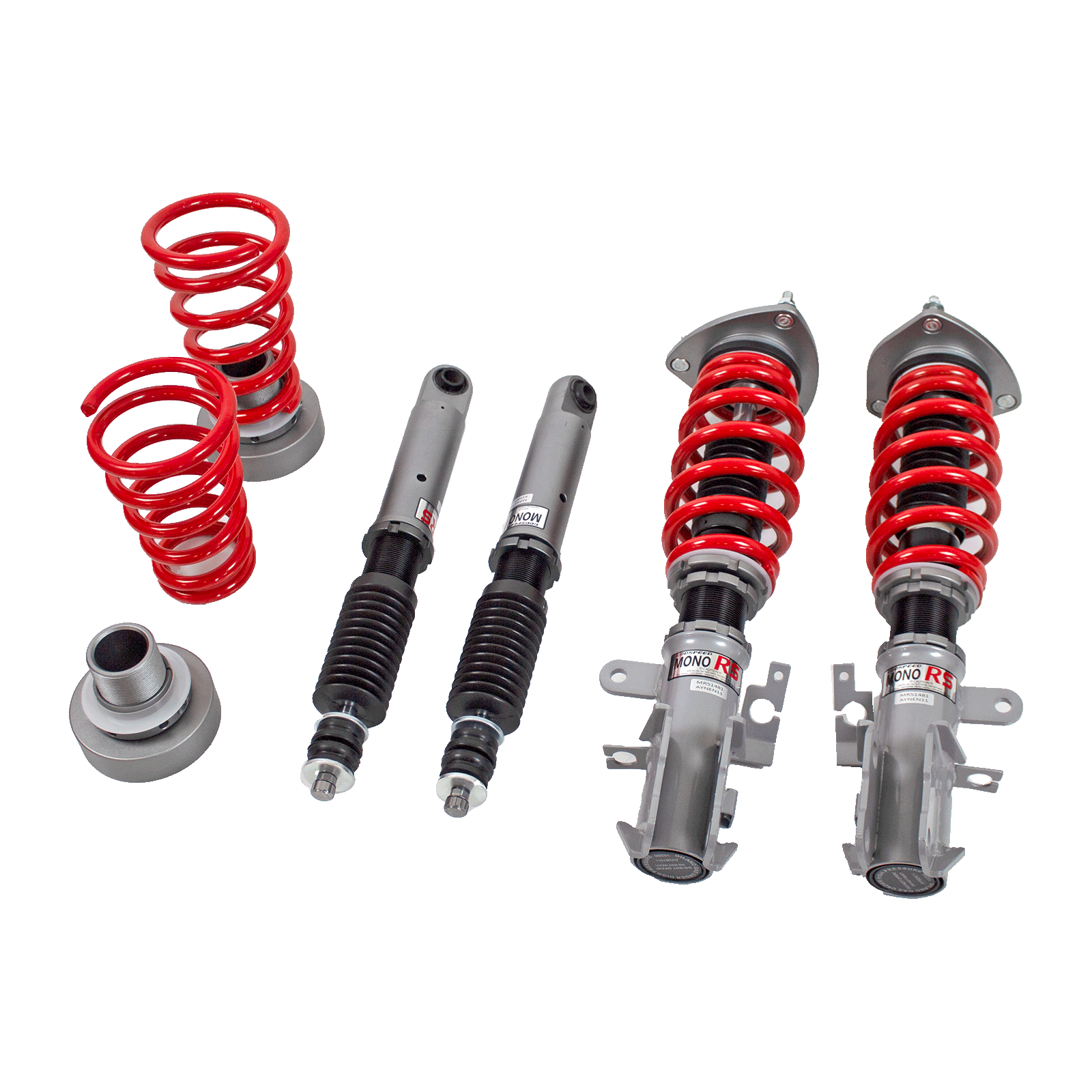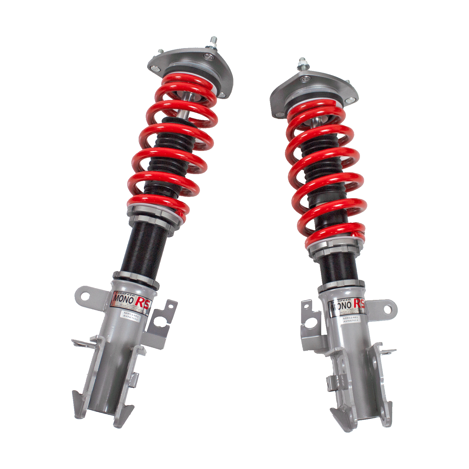 MonoRS Coilover damper kit by Godspeed Project are an intermediate suspension upgrade setup for daily and Sunday club racing. Lowering your car with improved springs over factory and paired with Monotube shocks with valving that allows 32 levels of rebound adjustment to improve handling without sacrifice comfort. Ride height can easily be adjusted by twisting the lower mount bracket. In order to keep weight gain at the minimum, most of attachments and accessories are CNC machined from billet aluminum. Koyo bearings are used when camber plate top mount is applicable depends on car models. To assure that our customers are getting high quality products, MonoRS coilovers are covered by 12 months limited warranty by the manufacturer from top to bottom just like other big brand name setups.