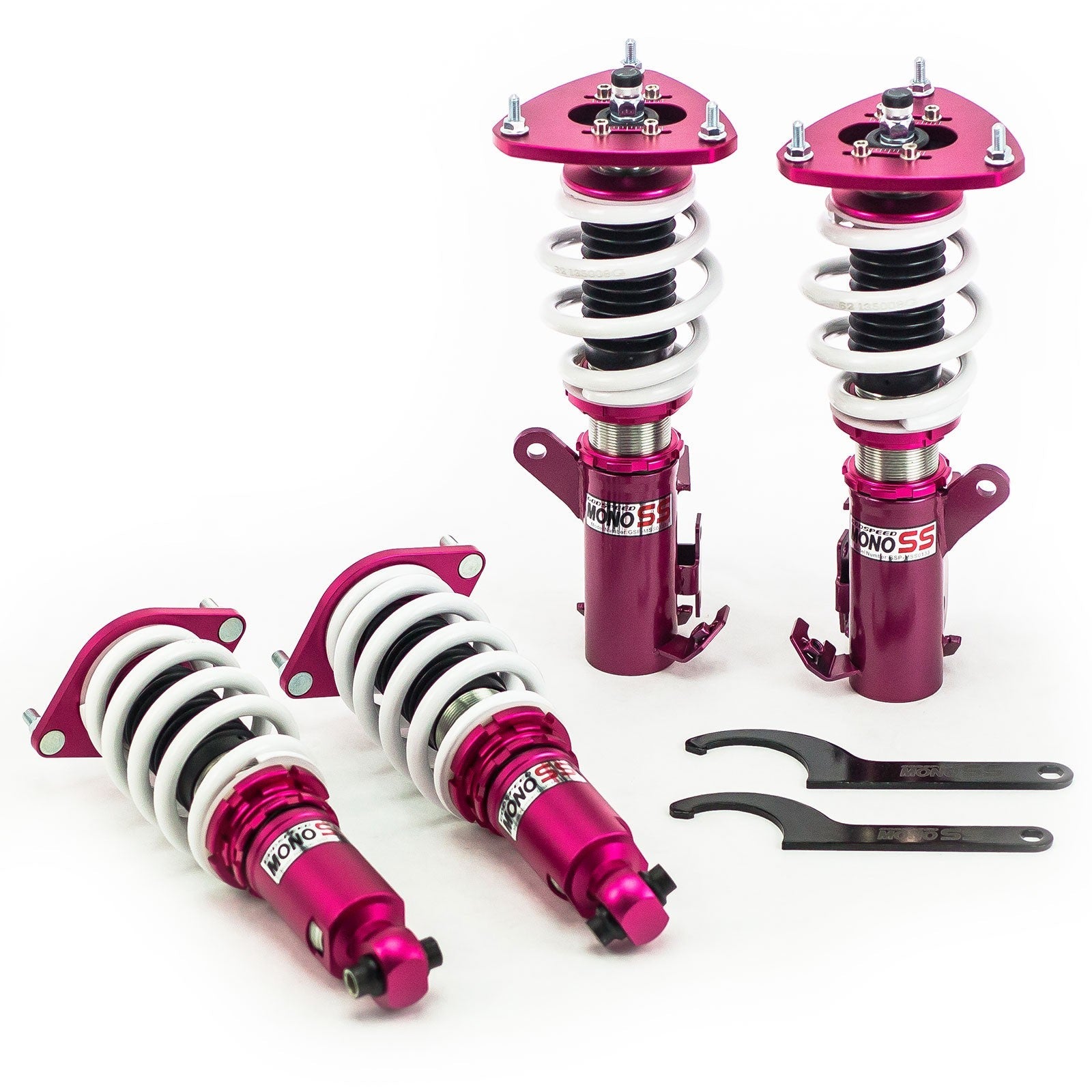 GodSpeed MonoSS coilovers are great entry level single adjustable coilovers. GodSpeed starts with a race coilover and tones it down for the street to give you an extremely capable coilover that you can comfortably use every day.  GodSpeed uses some of the best and most exotic components on the market such as a carbon seamless steel 52mm tube with a high performance internal shock piston that provides fast and precise damper response.  GodSpeed coilover springs are cold-bent from high strength SAE9252 steel to be comfortable and high performance.