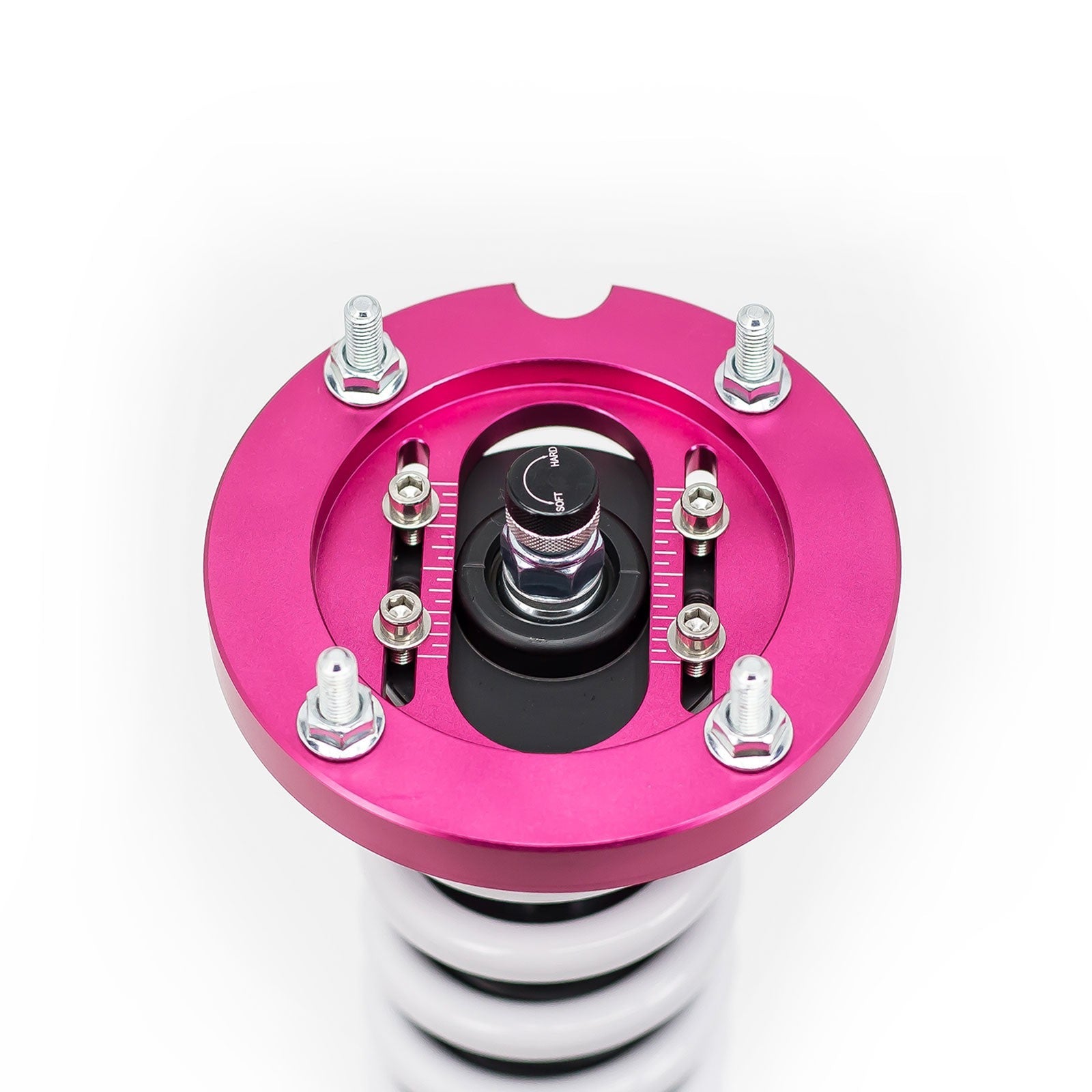 A big problem with a lot of entry level coilovers is that they use cheap shock oil, but GodSpeed doesn't follow that philosophy.  Race quality shock oil ensures exceptional damper performance any any temperature, on or off the track.  The GodSpeed coilover top hat uses a high performance Japanese KOYO 6204Z bearing pillowball mount (when applicable).  Bottom shock brackets are also top quality and made from T7075 forged aluminum or carbon steel brackets for light weight and durability.