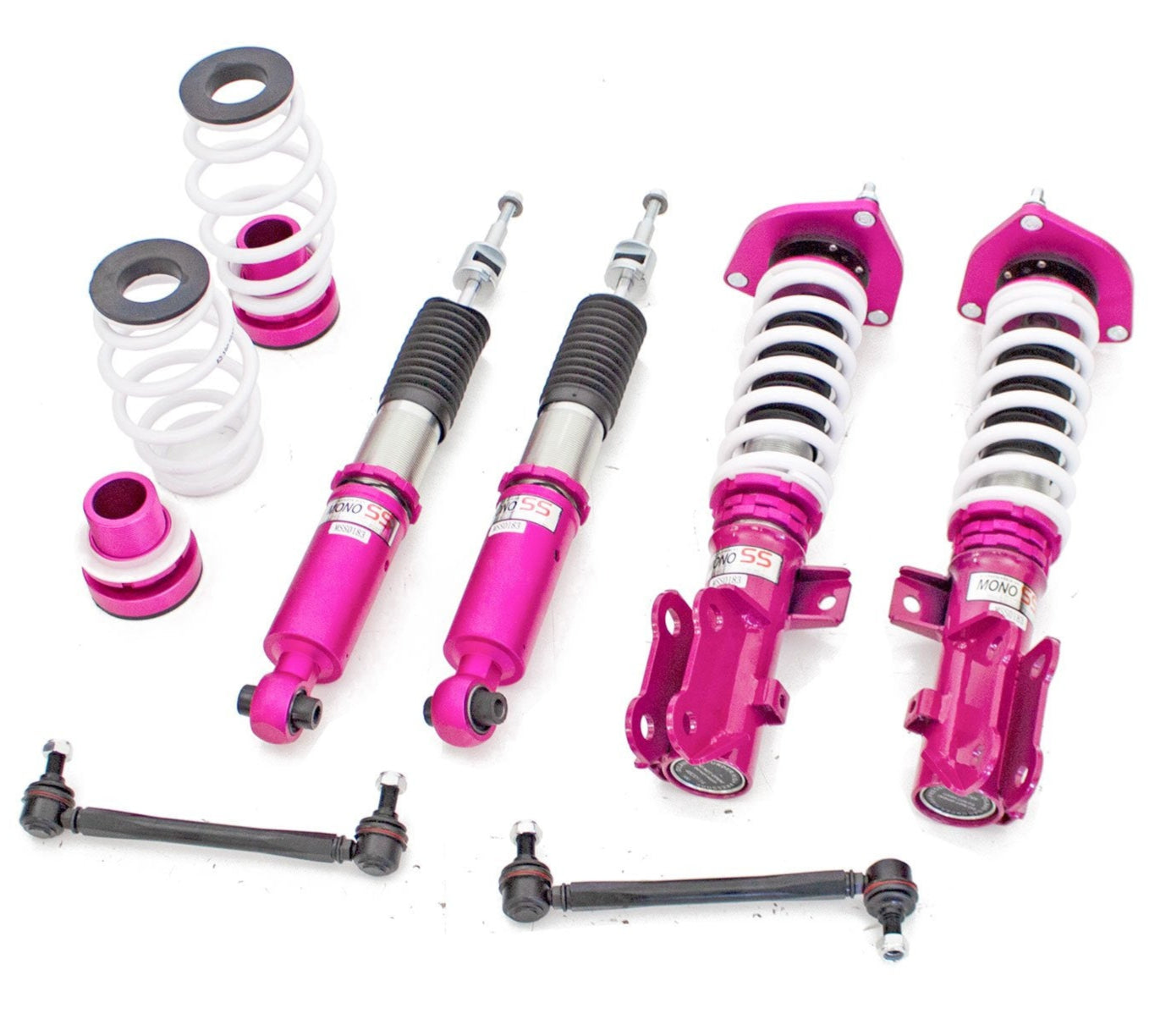 GodSpeed MonoSS coilovers are great entry level single adjustable coilovers. GodSpeed starts with a race coilover and tones it down for the street to give you an extremely capable coilover that you can comfortably use every day.  GodSpeed uses some of the best and most exotic components on the market such as a carbon seamless steel 52mm tube with a high performance internal shock piston that provides fast and precise damper response.  GodSpeed coilover springs are cold-bent from high strength SAE9252 steel to be comfortable and high performance.