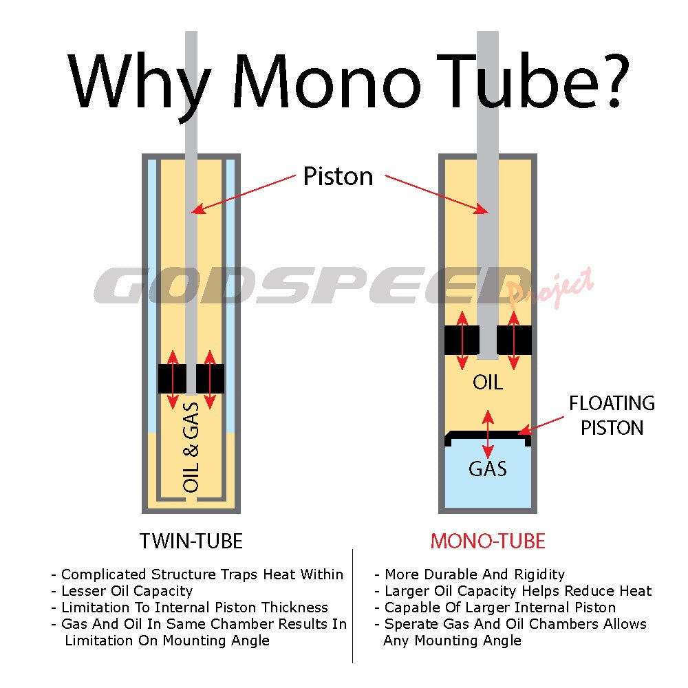 GodSpeed MonoSS coilovers are great entry level single adjustable coilovers. GodSpeed starts with a race coilover and tones it down for the street to give you an extremely capable coilover that you can comfortably use every day.  GodSpeed uses some of the best and most exotic components on the market such as a carbon seamless steel 52mm tube with a high performance internal shock piston that provides fast and precise damper response.  GodSpeed coilover springs are cold-bent from high strength SAE9252 steel to be comfortable and high performance.