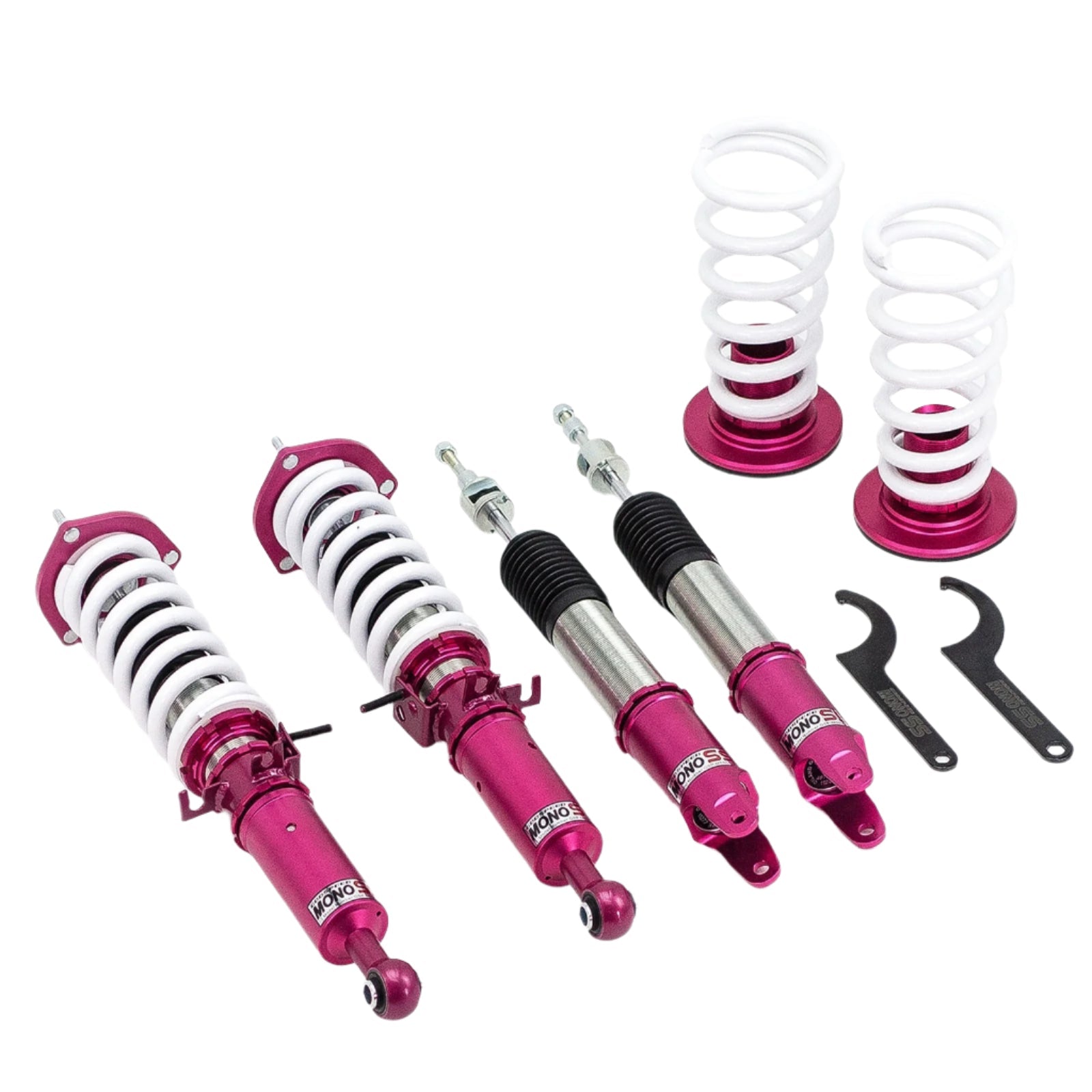 GodSpeed MonoSS coilovers are great entry level single adjustable coilovers. GodSpeed starts with a race coilover and tones it down for the street to give you an extremely capable coilover that you can comfortably use every day.  GodSpeed uses some of the best and most exotic components on the market such as a carbon seamless steel 52mm tube with a high performance internal shock piston that provides fast and precise damper response.  GodSpeed coilover springs are cold-bent from high strength SAE9252 steel to be comfortable and high performance.
