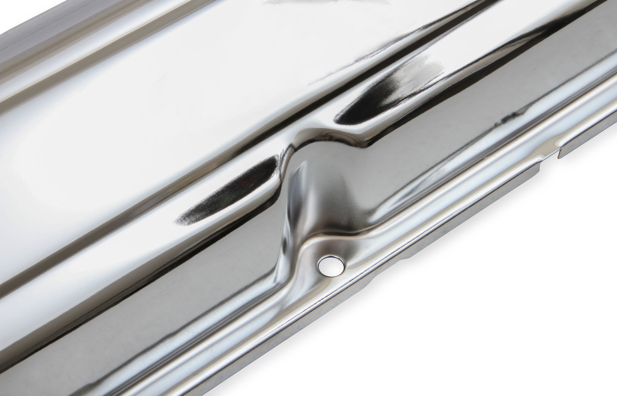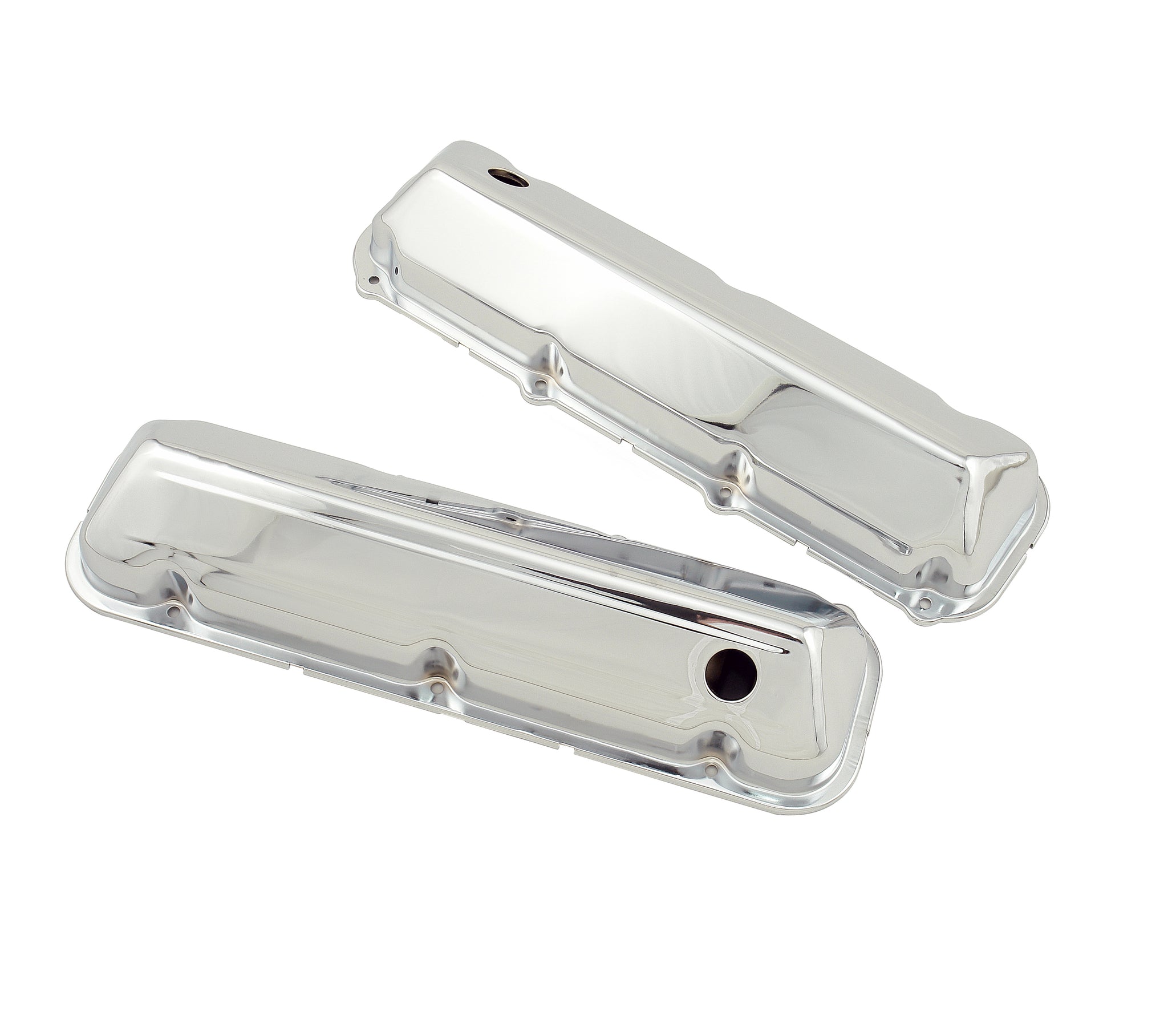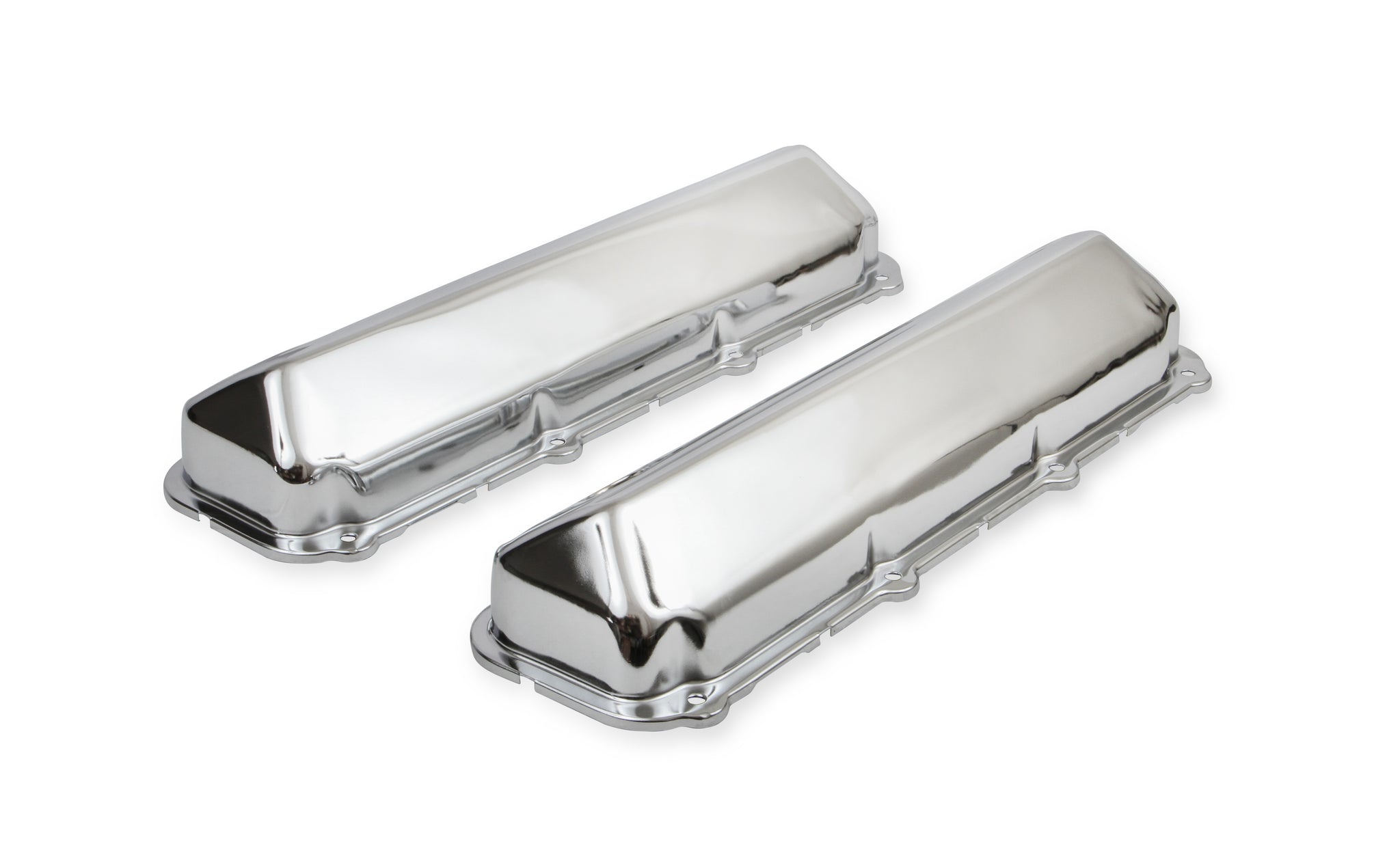 These Mr. Gasket chrome plated stamped steel valve covers have a flat smooth top, and internal baffles. 7-bolt design. Sold as a pair.