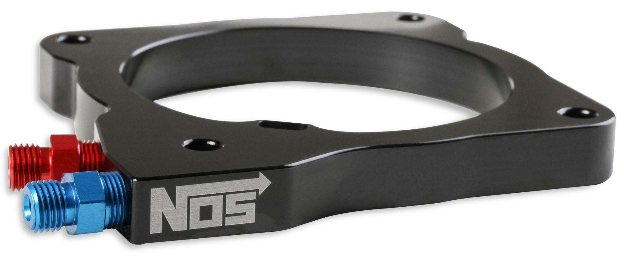 The NOS "Plate Only" kit allows our customers to build a custom nitrous system for their 5.7L and 6.1L Gen III Hemi powered muscle car, with the standard 80mm throttle body. This slim design is only 1/2" thick at the throttle body mounting flange. This allows maximum room forward of the throttle body to clear accessory drives, tensioner brackets or other obstacles that may interfere with a more forward mounted throttle body.