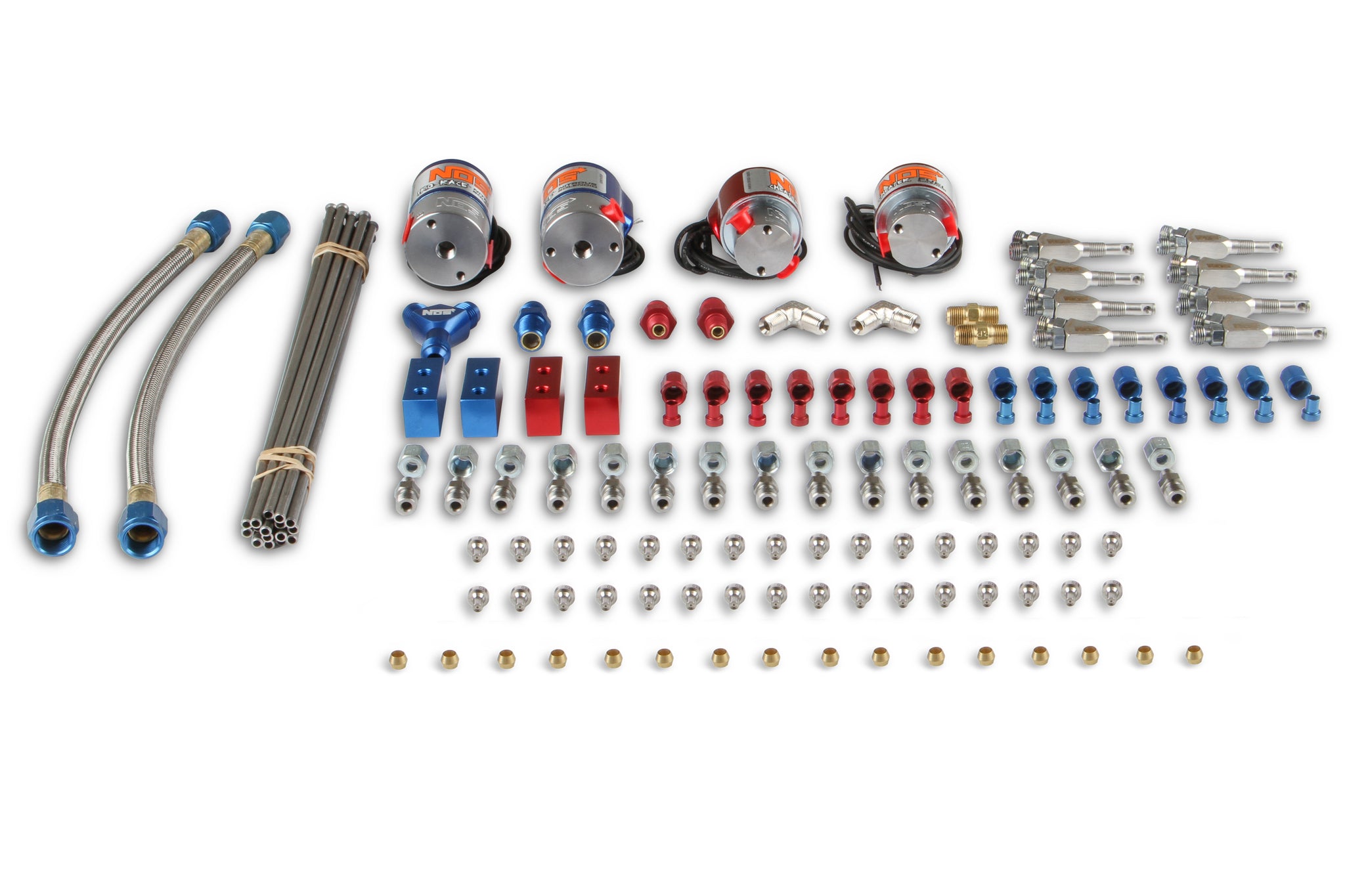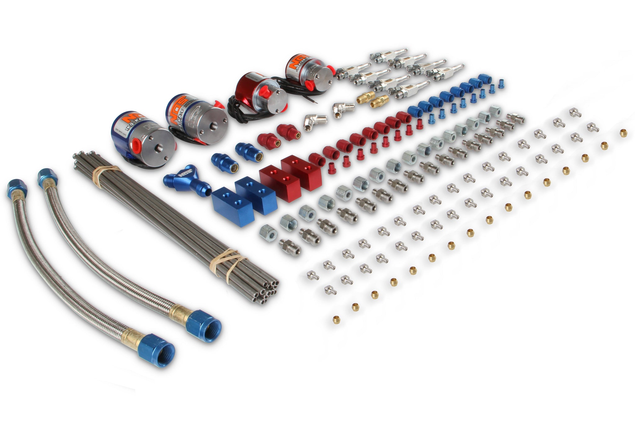 NOS has stepped it up with their new "Professional" series Pro-Shot Fogger kits. The new Pro-Shot Fogger kits feature the newly redesigned "Super A" Fogger nozzle. Fashioned from the reliable original Fogger design, the Super A nozzle is made out of stainless steel instead of brass for durability and strength. The Professional Pro-Shot Fogger kits also feature new distribution blocks and solenoids. The distribution blocks are made from billet aluminum and bright dip anodized in red and blue. They also feature 3/16" compression fittings that can be used with hard line or with poly line. The Pro-Shot Fogger kits come with a new Pro Race nitrous solenoid that features a new proprietary plunger material that resists swelling, yet seals as good as a Viton type material. The nitrous solenoid also features a new blue powder coated housing where the Cheater fuel solenoid features a red powder coated housing for easy identification and good looks. The new Pro-Shot Fogger System has had many hours of R&D at the race track which equates to the latest in new track tested tune ups. The Pro-Shot Fogger is for the professional nitrous user and is capable of providing an additional 500 HP. The Pro-Shot Fogger comes with new improved solenoids, stainless steel hard lines, distribution blocks, jetting and hardware. Available separately, NOS offers electrical wiring kits and bottle kits in a variety of combinations so you can make up your own custom kit combinations.