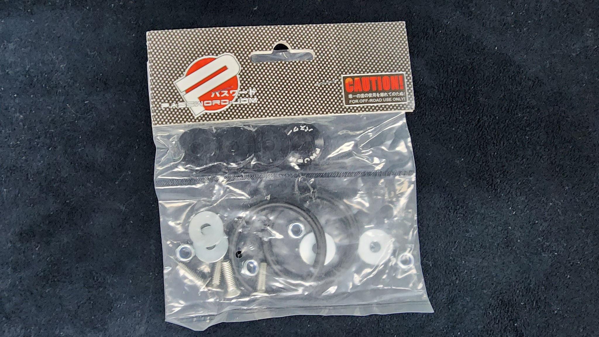 Password JDM Quick Release Fasteners are ideal for front bumpers, rear bumpers, and trunk / hatch lids, that you need to remove frequently, or remove and reinstall quickly, such as in the pits. Their quick release fasteners are for off road use only.