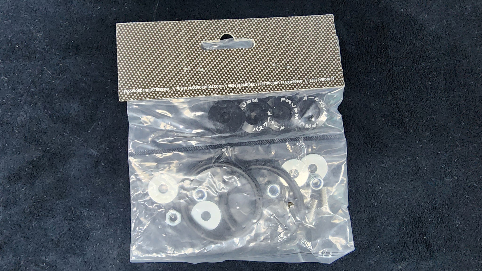 Password JDM fasteners are precision machined from billet aluminum, and have a black anodized finish. Includes stainless steel hardware. Includes 4 x Aluminum Fasteners, 4 x Stainless Bolts, 4 x Nuts, 4 x washers, and 2 x O-Ring Fasteners.Â