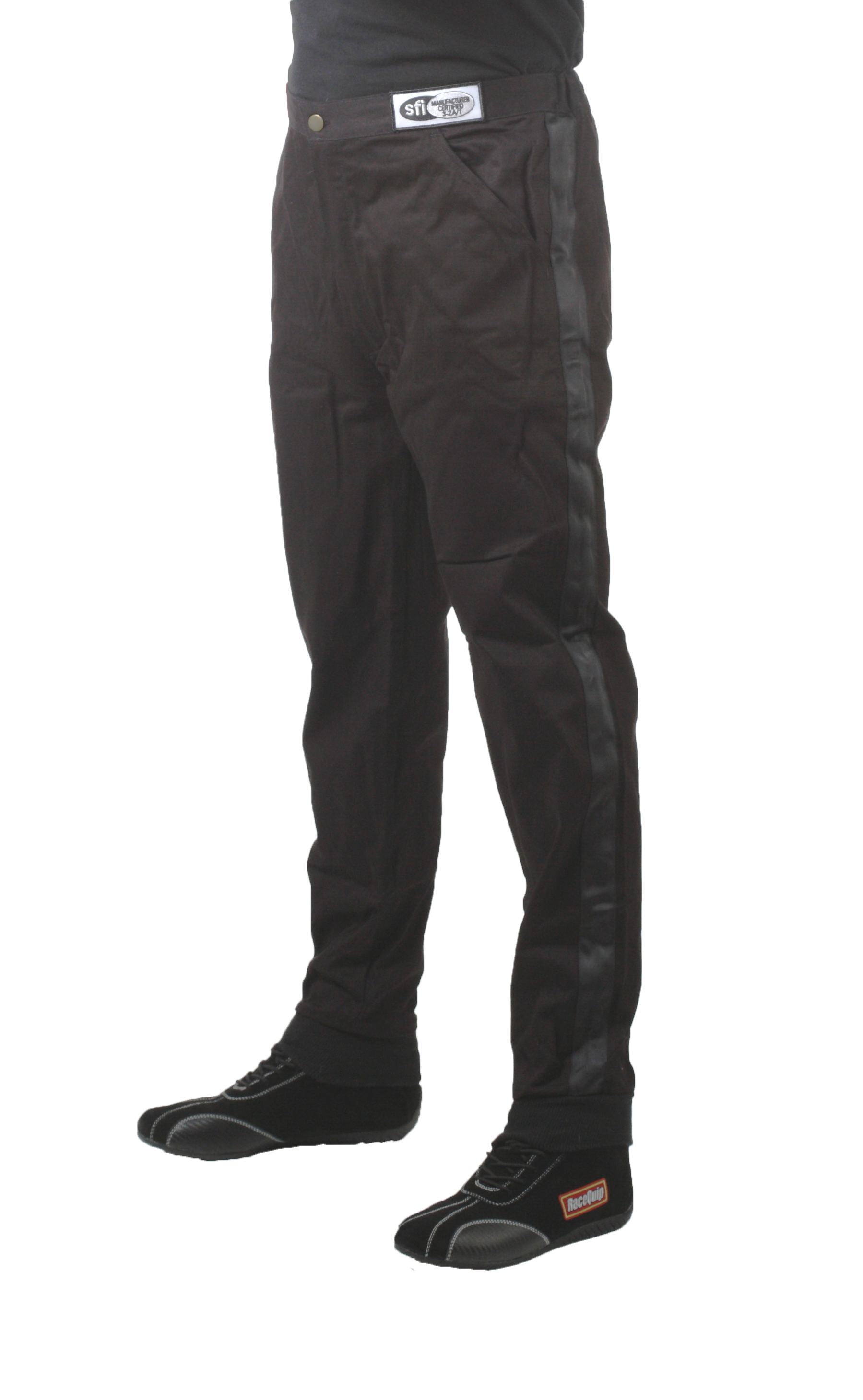 The RaceQuip 112 series single-layer SFI-1 racecar driver's fire suit pants are made from Pyrovatex® FRC material. Note that sometimes this material is referred to as "fireproof", but all auto racing safety gear is "fire retardant". Pyrovatex® offers the maximum combination of overall flame and heat protection, durability and comfort for the price. This fire-retardant cotton based (FRC) material is used because it retains the softness and breathability of cotton and will wick away moisture from the skin. Pyrovatex® fabric is gentle and non-irritating to even the most sensitive skin. The treatment process leaves the exterior surface shiny and supple. Since the Pyrovatex® process combines a chemical agent with the raw cotton fibers to create a bond at the molecular level, with proper care, the pants will retain their flame-retardant properties beyond the useful life of the garment. All race driver pants are assembled with heavy-duty, multi-needle, over-lock safety stitch machines to provide exceptional seam strength. All RaceQuip pants feature a high-quality heavy duty Nomex® backed brass zipper installed with a double overlap for a more secure front opening. Stylish contrasting full-length black leg stripes match the armband stripes found on RaceQuip driving jackets.