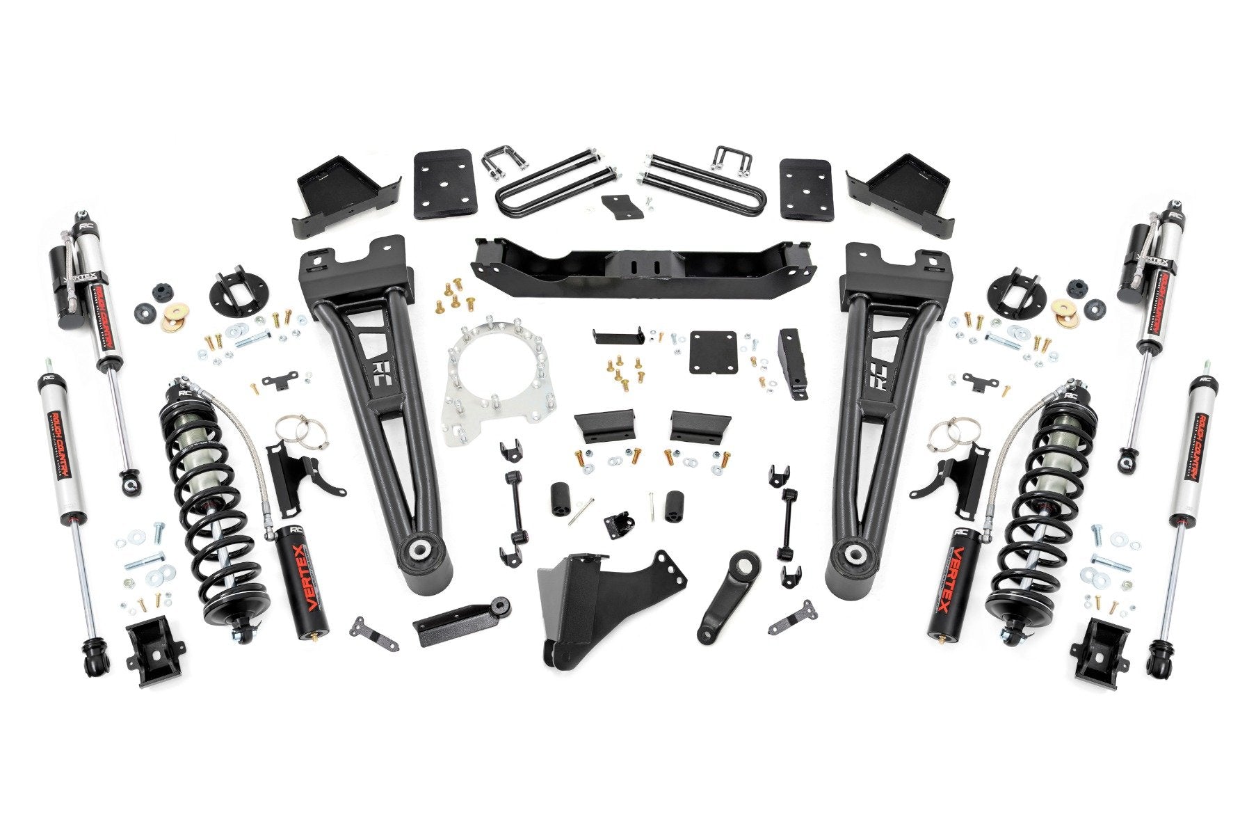 Superior Ride Quality.Take your fourth-generation Ford Super Duty to new heights with Rough Country's 6-inch Radius Arm Coilover Conversion Suspension Lift! This all-inclusive kit comes with everything you need for a total transformation of your truck. Run up to 37in tires while preserving the smooth, factory ride quality with this impressive upgrade.\When changing a vehicle's suspension, the key to preserving ride quality is keeping the geometry of all suspension components as close to their factory angles as possible. Rough Country's new 6-inch Radius Arm Suspension Lift features a set of ultra-durable Radius Arms, precision fit to bolt right into the factory mounts for an easier install and a more factory-like angle. At 27lbs each, these beefy, upgraded Radius Arms dwarf stock equipmentâ”¬Ă¡and feature durable durable rubber bushings for maximum vibration absorption. Rough CountryΓÇÖs 6" Radius Coilover Conversion Lift Kit features top-mounted reservoir brackets and coil-over mounts constructed from 1/4-inch steel. Utilizing this conversion kit you're removing the factory independent coil shock and coil set-up and replacing it with a massive 2.5in piston, nitrogen-charged, 8-stage adjustable Vertex Coilover. Rough CountryΓÇÖs Vertex Coilovers feature a monotube design with an external reservoir for increased oil capacity and damping sensitivity. When it comes to investing in a high-end kit, youΓÇÖll be pleased to find that Rough CountryΓÇÖs 2.5in piston design is beefier and offers an impressive 56% greater fluid capacity than the average reservoir shock. Each kit is paired with a monotube shock that provides optimal damping control.\Installation. Requiring cutting and drilling to install, an estimated timeframe of 6-10 hours is recommended to complete this full installation. This full kit can be installed at home and can be completed efficiently and quickly!\Limited Lifetime Replacement Warranty. Rough Country's 6-inch Radius Arm Coilover Conversion Suspension Lift Kit is backed with a limited lifetime replacement warranty towards manufacturer defects. As such, the product is protected from structural and workmanship damage after the date of purchase. With our industry-leading warranty give yourself peace of mind when using Rough Country's Suspension products!