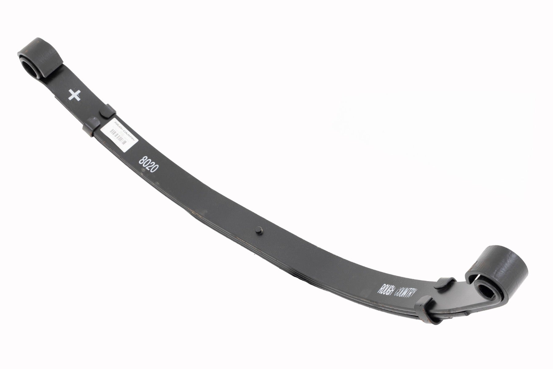 Added Lift Height and Ride Comfort. Take your suspension kit to the next level with Rough Country's Replacement Leaf Springs. Constructed from high-quality materials and designed specifically for the weight of your vehicle. This enhanced replacement spring will provide a factory-like feel while retaining your suspension lift height. \Durable and Off-Road Ready. Rough Country's Replacement Leaf Springs are designed to tackle any terrain that they are faced with. Featuring a multi-leaf design and spring pads this reduces the friction and maximizes comfort. Each leaf pack utilizes tapered leaves for improved flexibility at their ends. \Installation. Rough Country's Replacement Leaf Springs offer a 100% bolt-on installation estimated to take approximately 1-2 hours depending on vehicle condition. Simply remove the pre-existing leaf spring and use the stock hardware to equip your vehicle with this high-quality replacement. \Lifetime Replacement Warranty. Rough Country's Replacement Leaf is backed with a 5-year replacement warranty towards manufacturer defects. As such, the product is protected from structural and workmanship damage after the date of purchase. With our industry-leading warranty give yourself peace of mind when using Rough Country's Suspension products!
