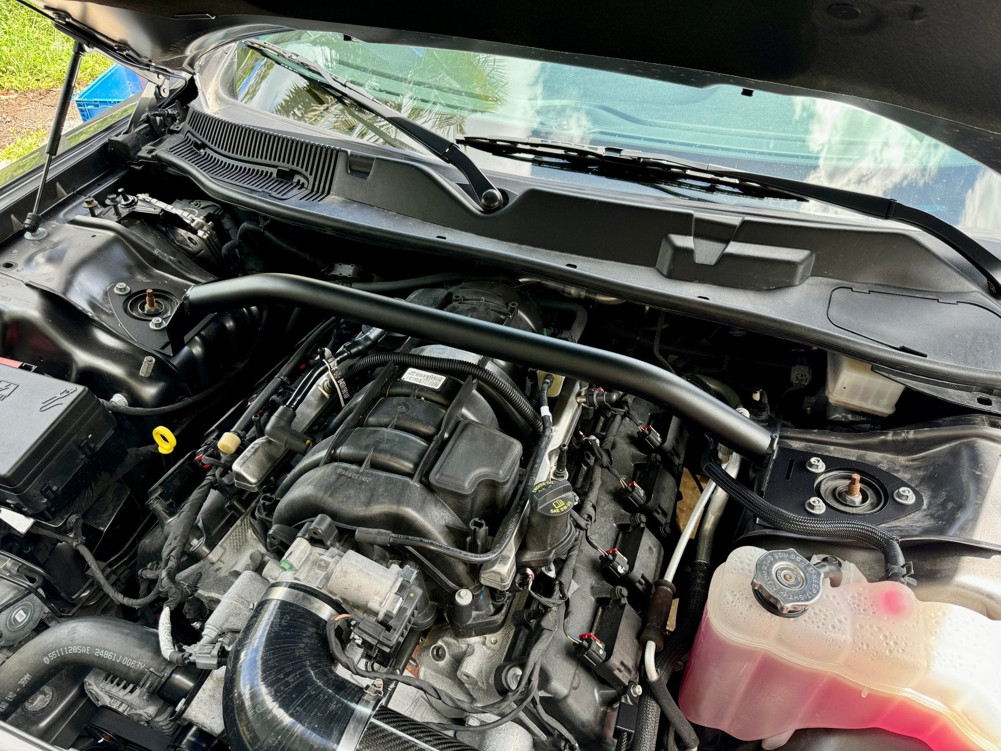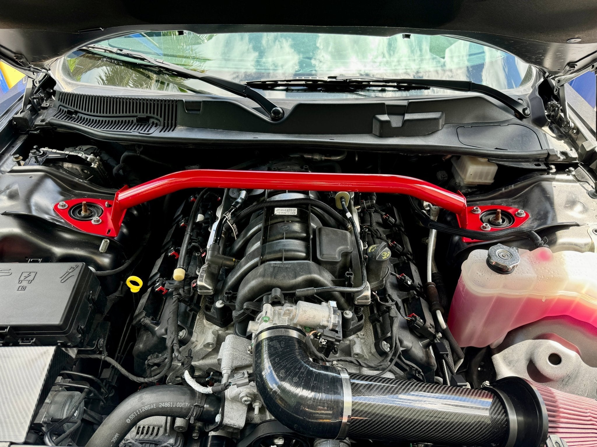 Our 2-point front strut tower brace is made in-house in the USA from aluminum tube welded to precise laser-cut aluminum mounting plates. Installation is a breeze, as you simply remove the 6 strut tower nuts, drop our brace into place, and re-install the nuts. Fits 5.7L, 392 engines with no engine cover.