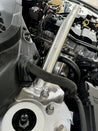 Our front strut tower brace is made in-house in the USA from aluminum tube welded to precision-cut aluminum mounting plates.