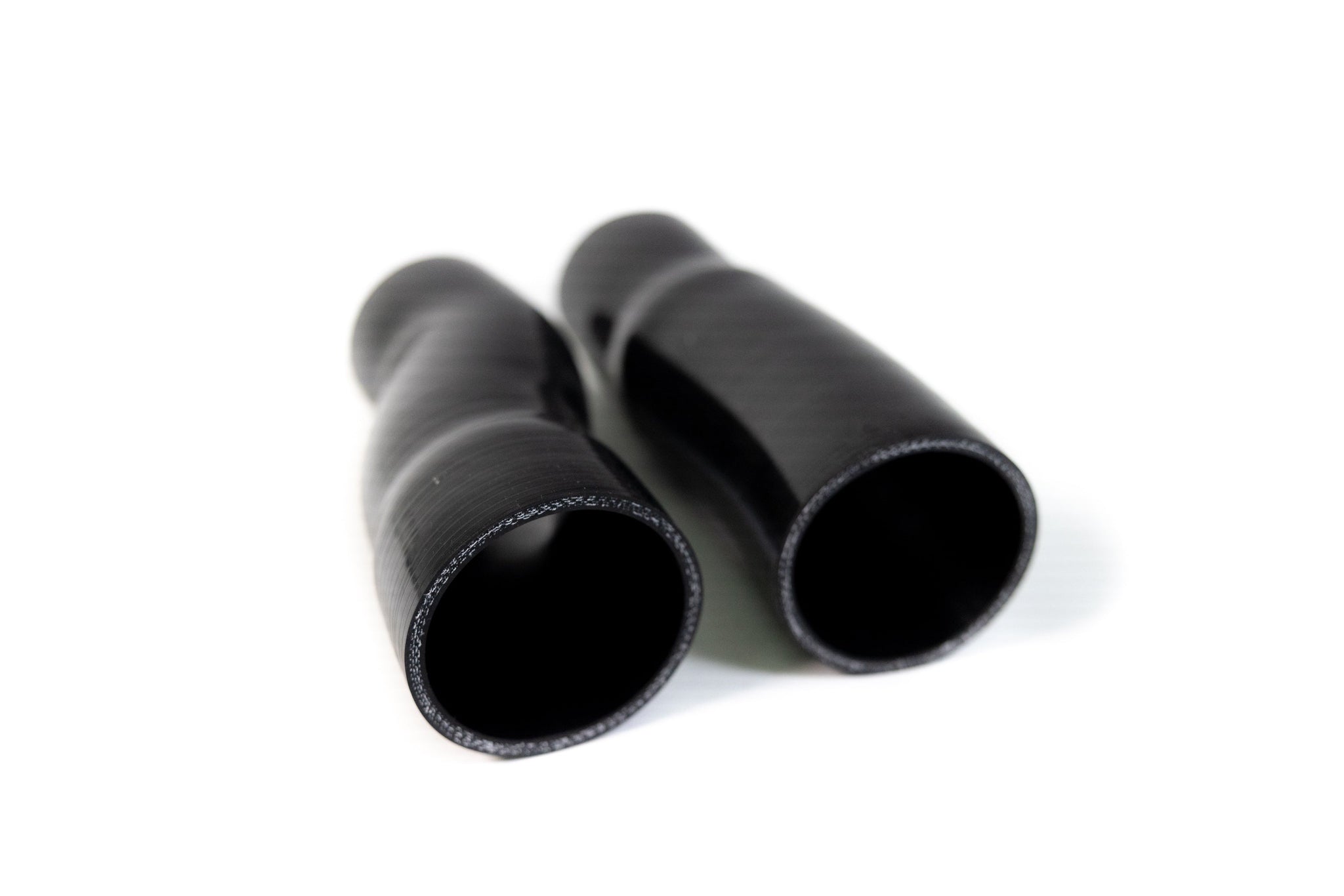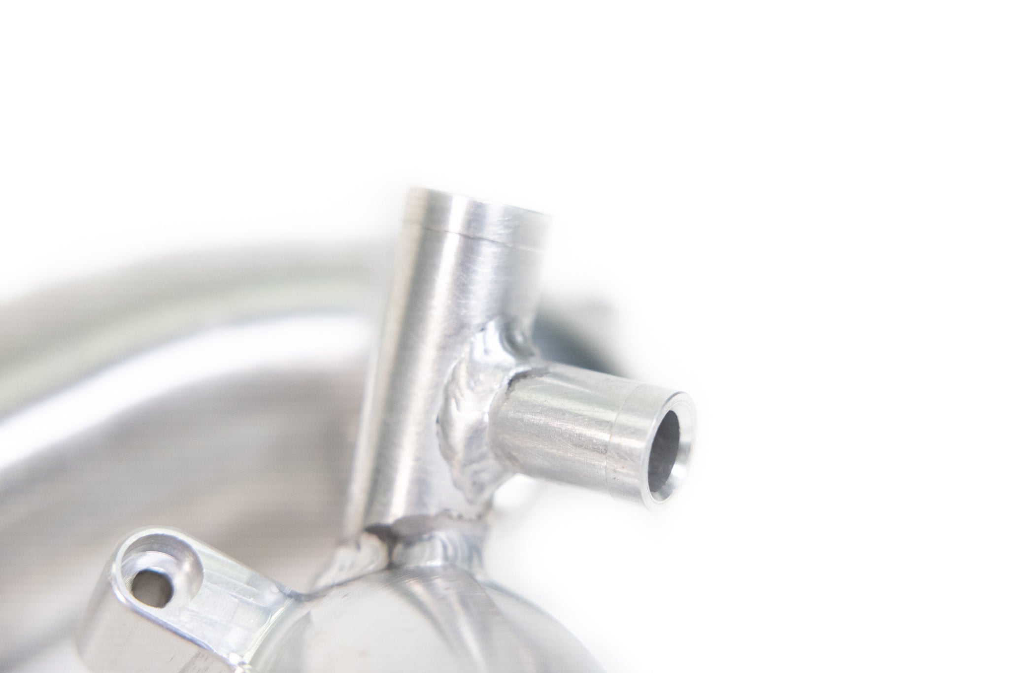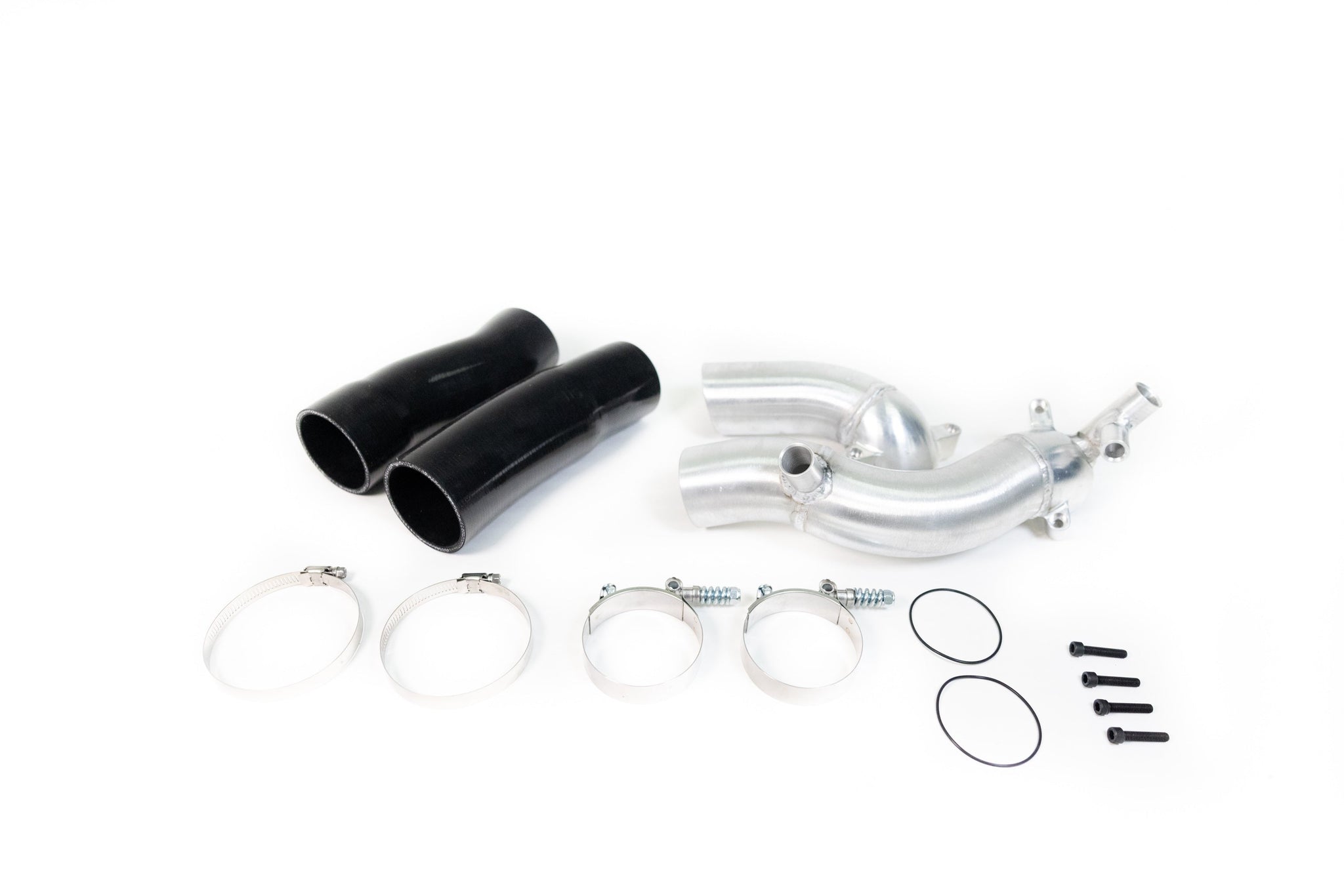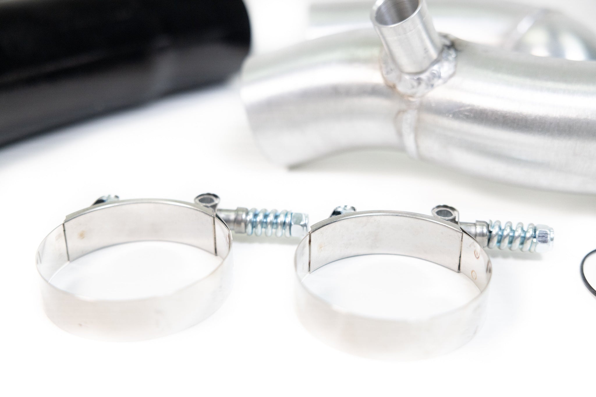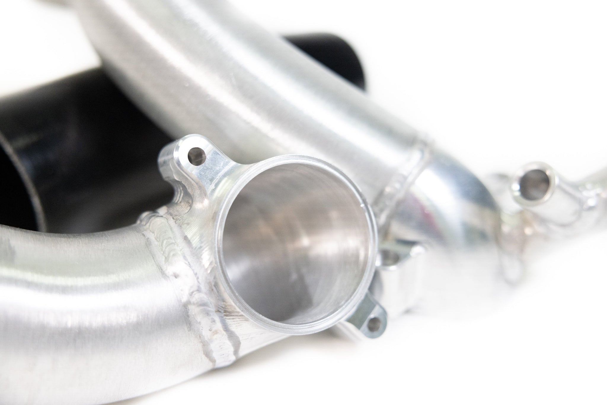 The machined inlet flanges transition to 63mm aluminum piping which extends all the way to the 6-Layer reinforced silicone couplers.  These couplers are extra durable to prevent any deformation during induction on demanding builds.