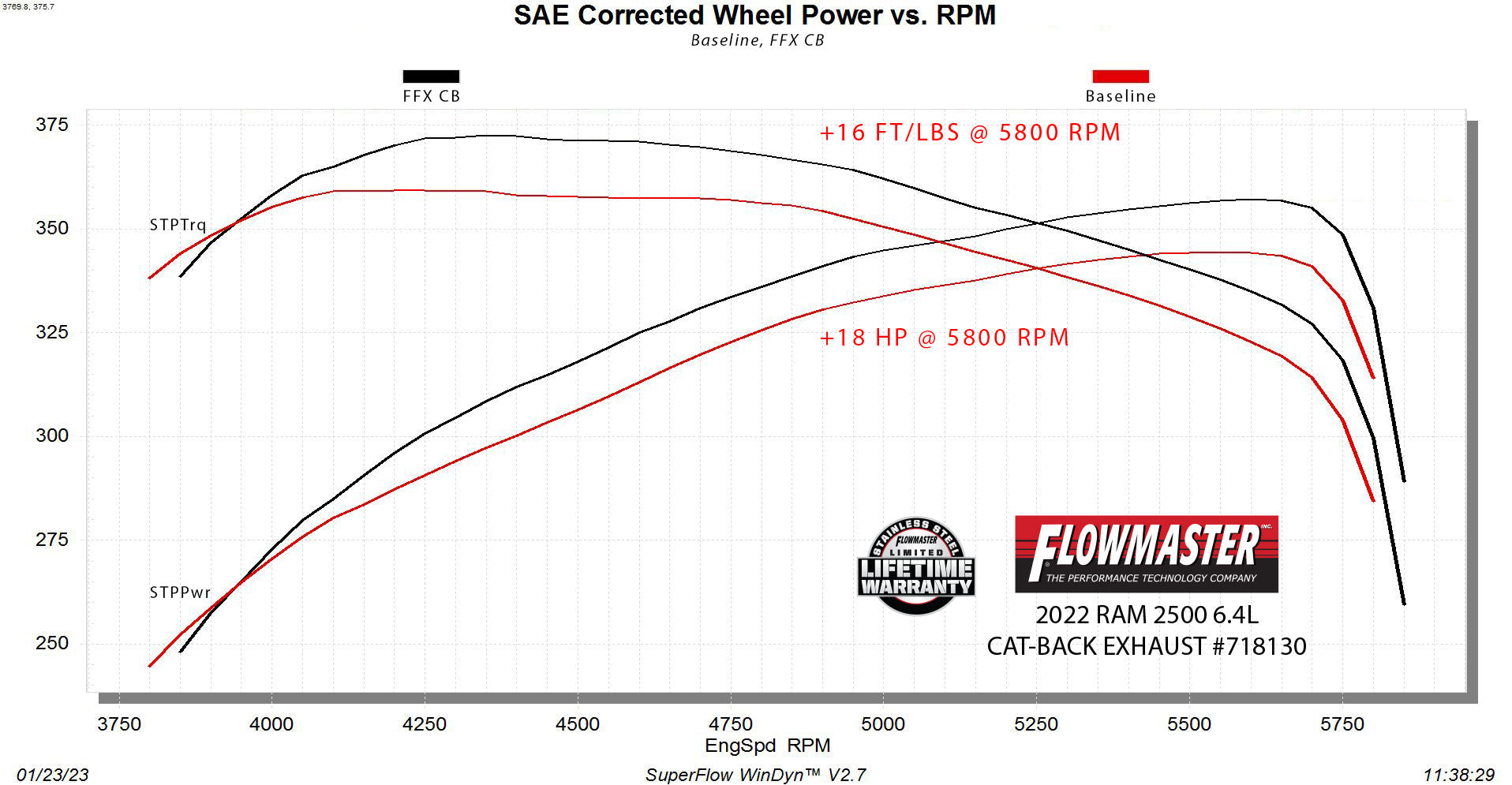 This Flowmaster® Flow FX® cat-back exhaust system for the 2014-2024 RAM 2500 trucks with the 6.4-liter HEMI engine is manufactured using durable 409 stainless steel throughout and features 3.50 to 3.00-inch mandrel bent pipes for better exhaust gas flow. Maximum increases on the dyno revealed 18 hp and 16 lb-ft of torque at the rear wheels over stock. This system exits with dual 4.00-inch black stainless steel tips for added style and a custom look. The system uses all the existing factory hanger locations and includes installation instructions and all necessary hardware for an easy installation that you can do at home. Backed by Flowmaster's Lifetime Limited Warranty.