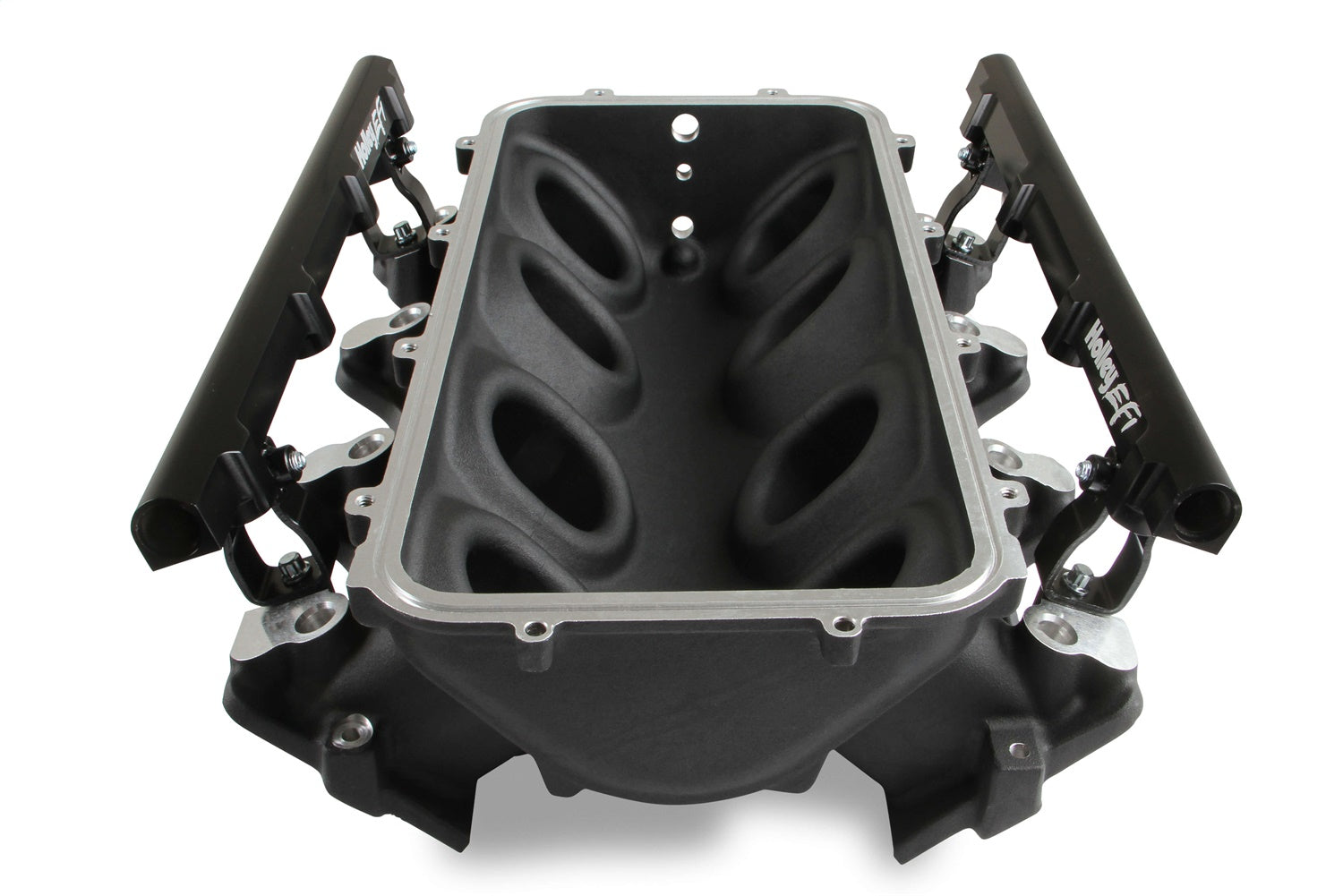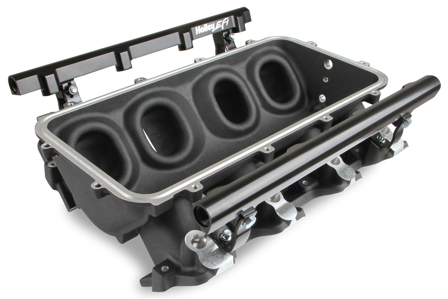 The short runner, low-profile base intake manifold intended for forced induction applications was conceived to package with an air to water plenum mounted intercooler with a shorter overall height than possible with other existing intake manifolds. The fuel rail kits come with two sets of brackets. A set for long (usually standard length) fuel injectors and a set for short (such as Pico, or LS7) fuel injectors.