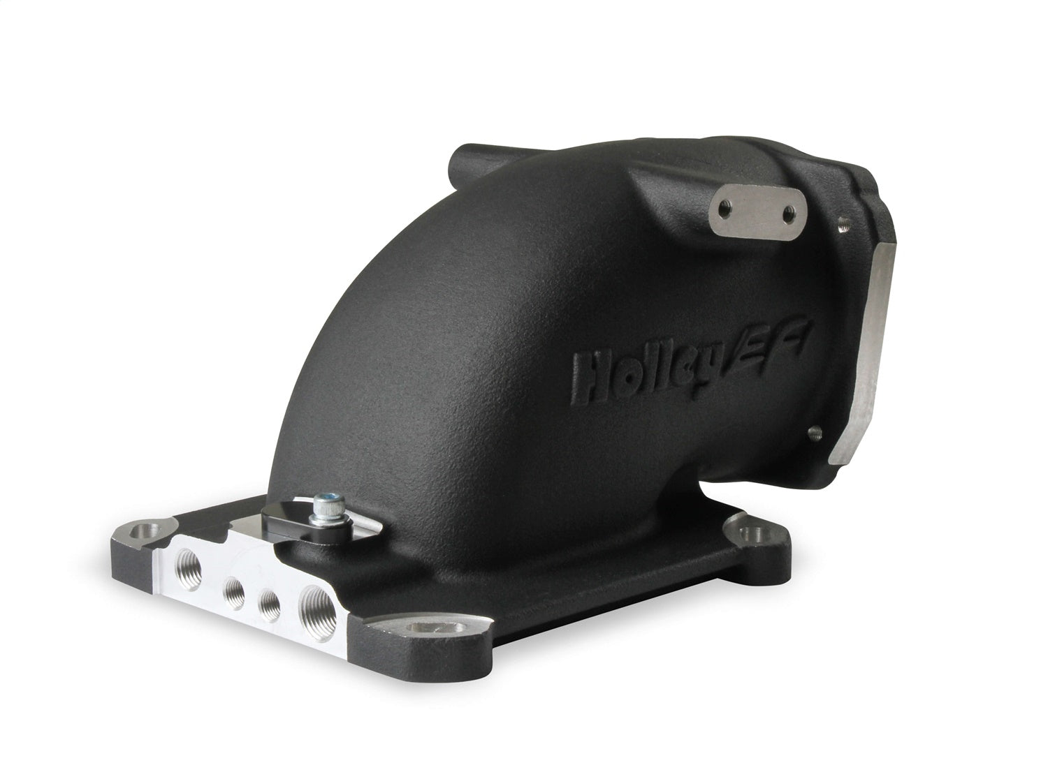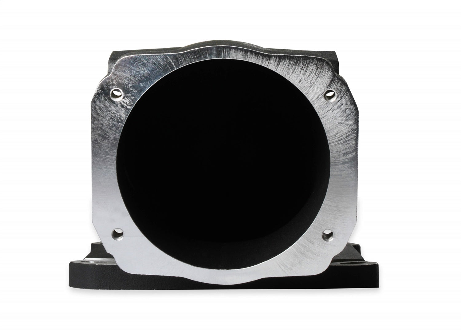 This cast EFI intake elbow allows the use of GM LS throttle bodies on any intake manifold w/ the 4150 mounting flange. Slotted mounting holes & dual throttle cable mounting bracket bosses allow the elbow & throttle body to be mounted forward, sideways, or rearward. Features (4) vacuum ports, MAP sensor port, machined / port matched to 4150 gasket, and 100° throttle body angle for extra hood clearance. Includes MAP sensor port cover, gaskets & hardware.