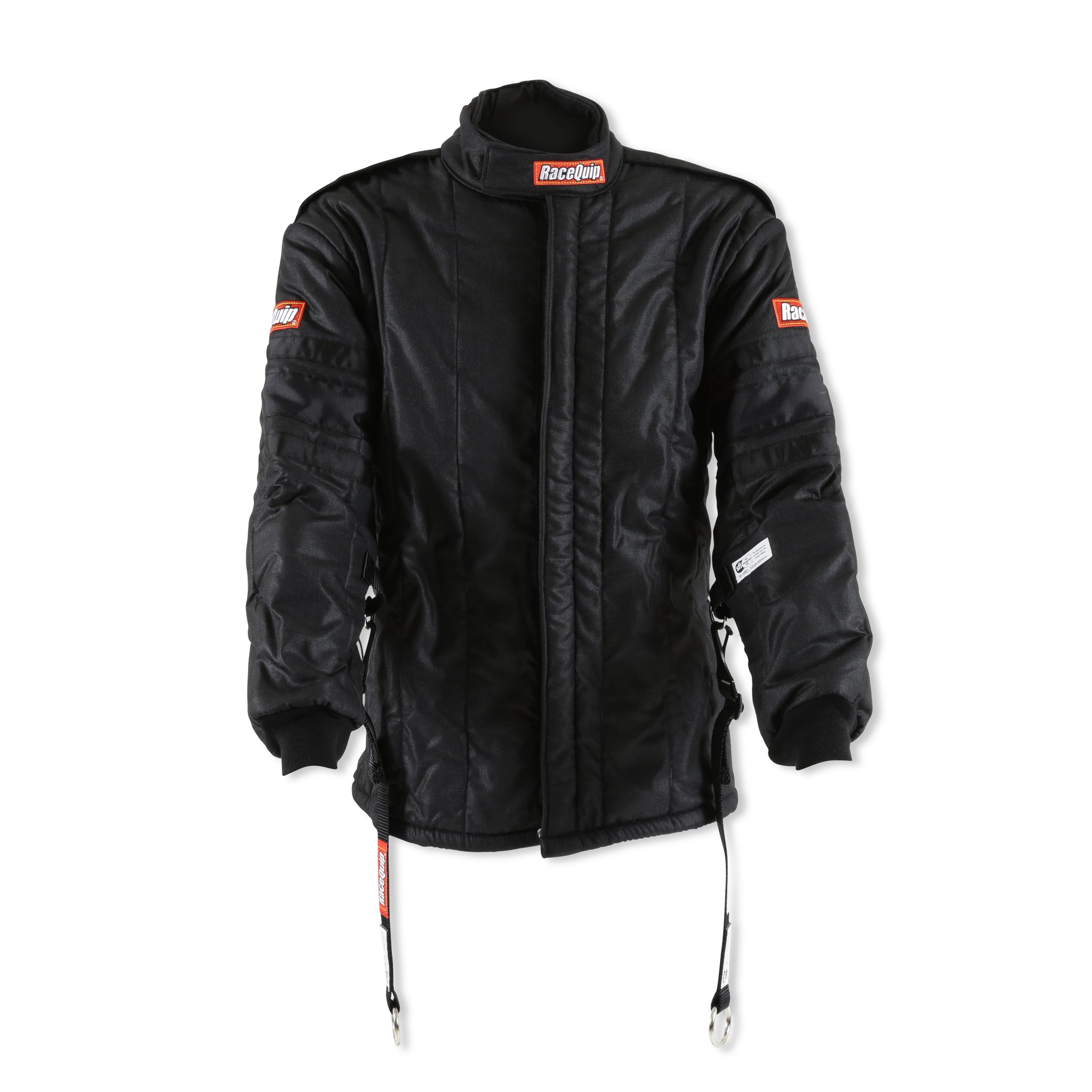 This RaceQuip multi-layer SFI-15 racing driver's fire suit jacket is made up of multiple layers of especially pliable quilted Nomex®. This proprietary soft & supple aramid fabric blend creates the most flexible and comfortable SFI 3.2A/15 racing jacket on the market. The outer layer of Nomex® features a shiny black finish with vertical quilting. All suit accents are black including stripes. collar, zipper overlap, epaulets, and cuffs. RaceQuip uses an oversize heavy duty brass YKK Nomex® backed zipper for added durability. Elastic gathers near the waist keep the jacket pulled taught on the bottom for proper fit. Exceeds SFI 3.2A/15 specs with tag placed on back of collar. Includes SFI 3.3 Rated Arm Restraint D-Rings and Clip-On Tethers. Manufactured in sizes Small - 2X-Large (refer to sizing chart).