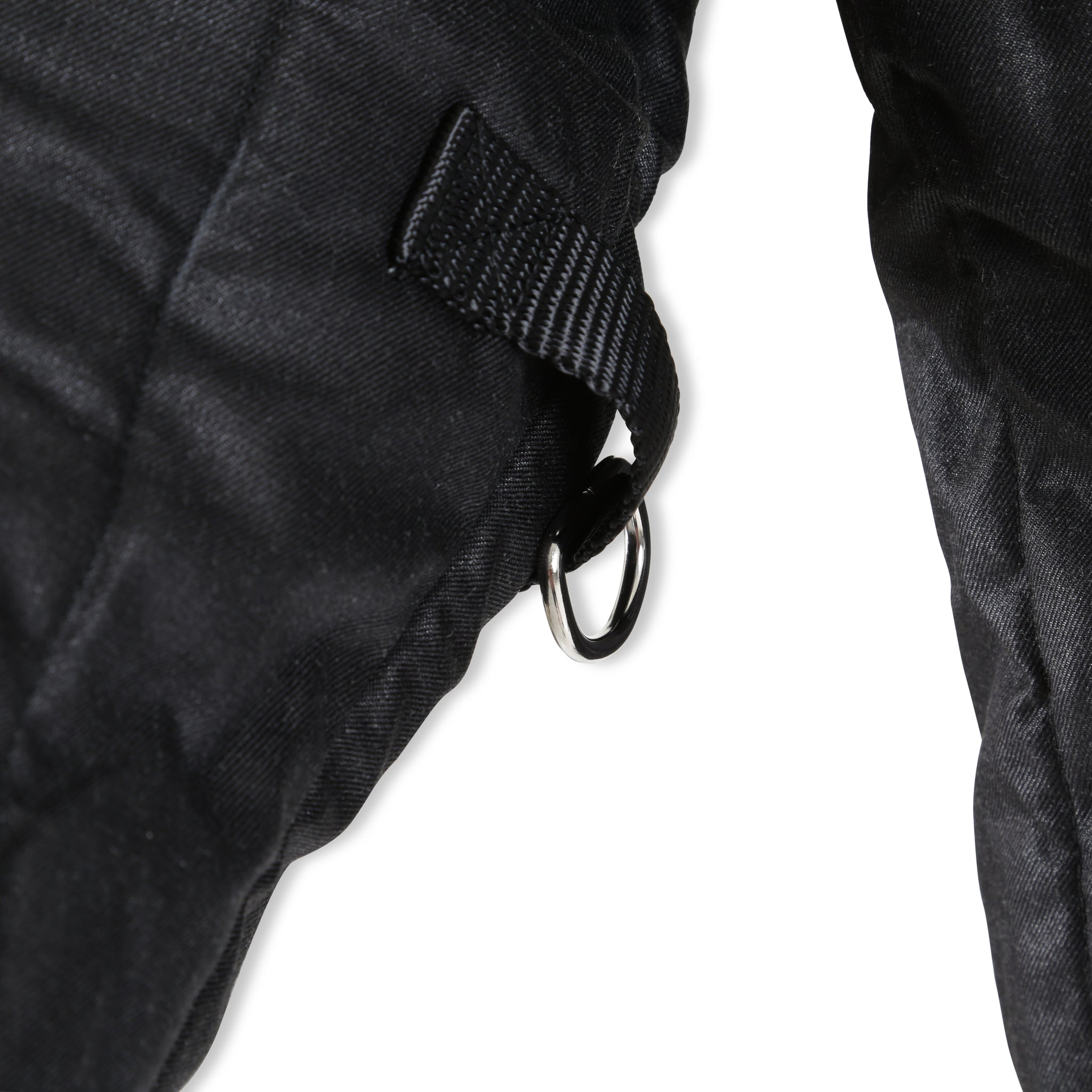 This RaceQuip multi-layer SFI-15 racing driver's fire suit jacket is made up of multiple layers of especially pliable quilted Nomex®. This proprietary soft & supple aramid fabric blend creates the most flexible and comfortable SFI 3.2A/15 racing jacket on the market. The outer layer of Nomex® features a shiny black finish with vertical quilting. All suit accents are black including stripes. collar, zipper overlap, epaulets, and cuffs. RaceQuip uses an oversize heavy duty brass YKK Nomex® backed zipper for added durability. Elastic gathers near the waist keep the jacket pulled taught on the bottom for proper fit. Exceeds SFI 3.2A/15 specs with tag placed on back of collar. Includes SFI 3.3 Rated Arm Restraint D-Rings and Clip-On Tethers. Manufactured in sizes Small - 2X-Large (refer to sizing chart).