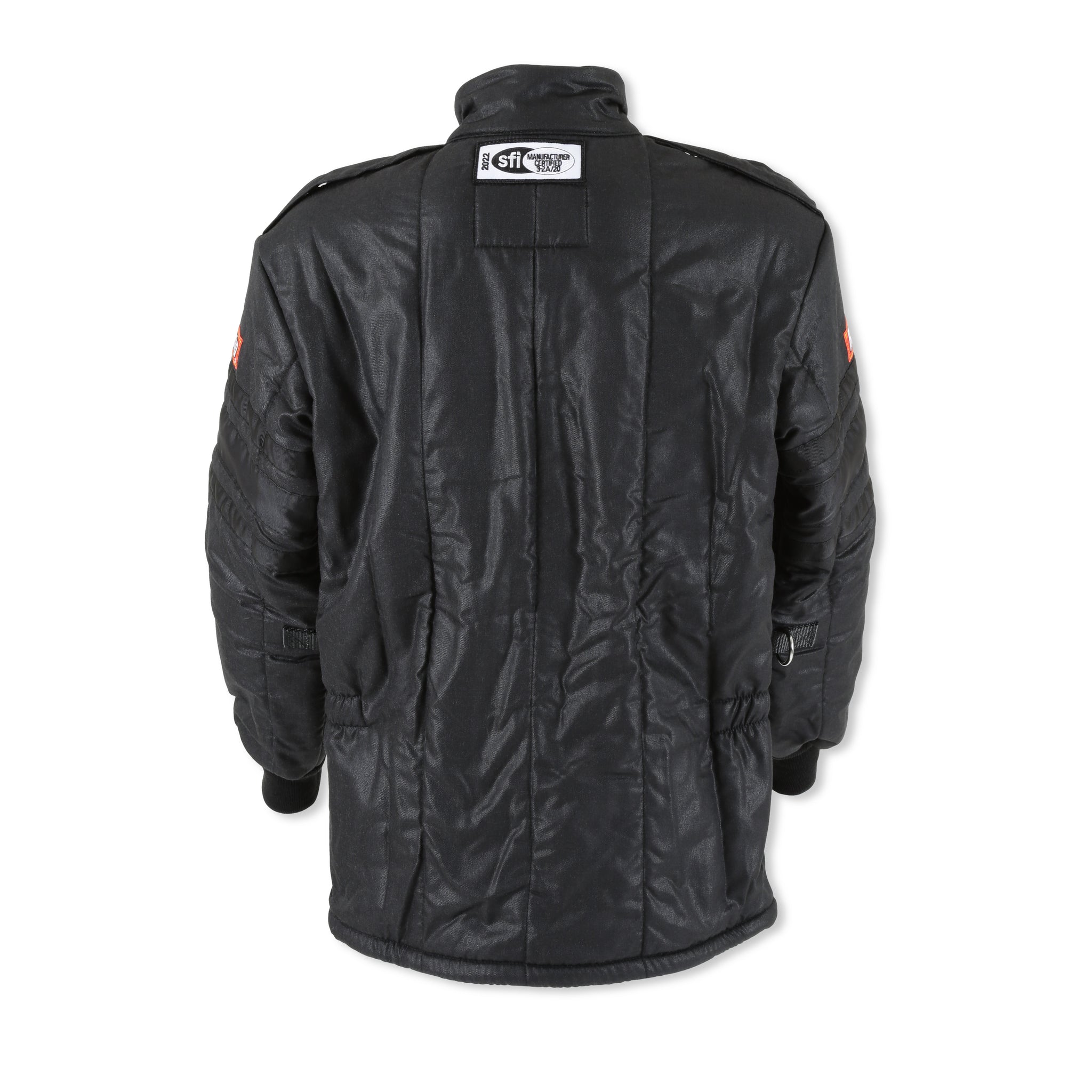 This RaceQuip multi-layer SFI-20 racing driver's fire suit jacket is made up of multiple layers of especially pliable quilted Nomex®. This proprietary soft & supple aramid fabric blend creates the most flexible and comfortable SFI 3.2A/20 racing jacket on the market. The outer layer of Nomex® features a shiny black finish with vertical quilting. All suit accents are black including stripes. collar, zipper overlap, epaulets, and cuffs. RaceQuip uses an oversize heavy duty brass YKK Nomex® backed zipper for added durability. Elastic gathers near the waist keep the jacket pulled taught on the bottom for proper fit. Exceeds SFI 3.2A/20 specs with tag placed on back of collar. Includes SFI 3.3 Rated Arm Restraint D-Rings and Clip-On Tethers. Manufactured in sizes Small - 2X-Large (refer to sizing chart).