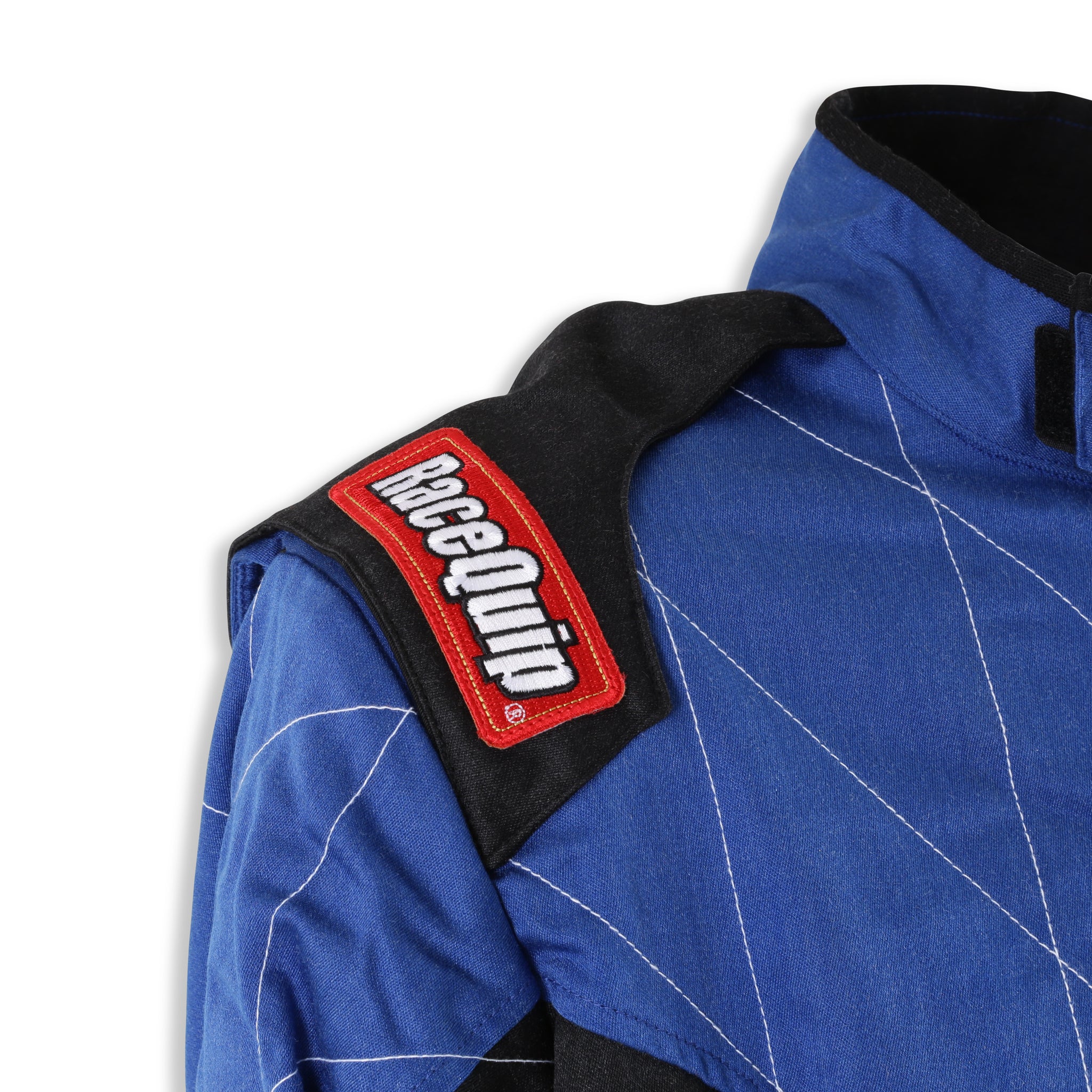 The RaceQuip 9160 series Chevron-5 multi-layer SFI-5 racecar driver's fire suit is made up of an outer layer of durable Nomex® and a soft, comfortable and lightweight Nomex® liner with Chevron pattern box quilting. The stylish modern Euro design is accentuated with black trim Euro epaulets, a two-piece adjustable belt and black side panels. The side panels feature knit stretch panels for flexibility in the torso and the 180° floating arm gussets increase flexibility in the arms. A stretch panel in the back at the waistline keeps the suit cinched for a custom fitted look. Cuffs are black Nomex® with a boot cuff leg trimmed in black. The Chevron-5 suits feature a high quality, heavy duty Nomex® backed brass, two-way zipper installed with a double overlap for a more secure front opening. Internal bag pockets are included for convenience. Exceeds SFI 3.2A/5 specs. Available in Black, Red or Blue with Black accents. Manufactured in sizes Small - 3X-Large (refer to sizing chart). Note that sometimes these materials are referred to as "fireproof", but actually all auto racing safety gear is "fire retardant".