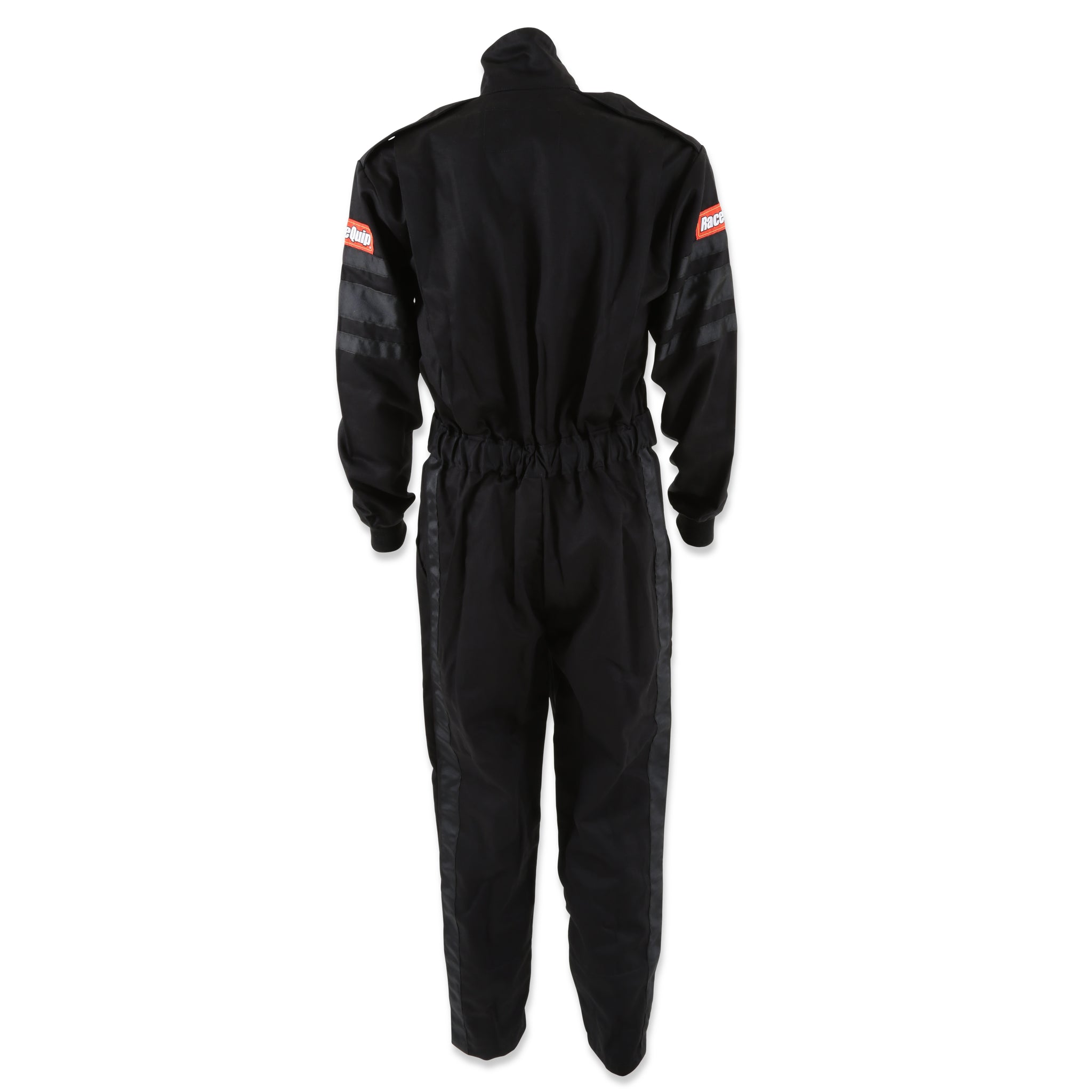The RaceQuip 110 series single-layer SFI-1 racecar driver's fire suit is made from Pyrovatex® FRC material. Note that sometimes this material is referred to as "fireproof", but all auto racing safety gear is "fire retardant". Pyrovatex® offers the maximum combination of overall flame and heat protection, durability and comfort for the price. This fire-retardant cotton based (FRC) material is used because it retains the softness and breathability of cotton and will wick away moisture from the skin. Pyrovatex® fabric is gentle and non-irritating to even the most sensitive skin. The treatment process leaves the exterior surface shiny and supple. Since the Pyrovatex® process combines a chemical agent with the raw cotton fibers to create a bond at the molecular level, with proper care, the suit will retain its flame-retardant properties beyond the useful life of the garment. All racing suits are assembled with heavy-duty, multi-needle, over-lock safety stitch machines to provide exceptional seam strength. All RaceQuip suits feature a high-quality heavy duty Nomex® backed brass zipper installed with a double overlap for a more secure front opening. Stylish contrasting armband stripes match the full-length leg stripes.