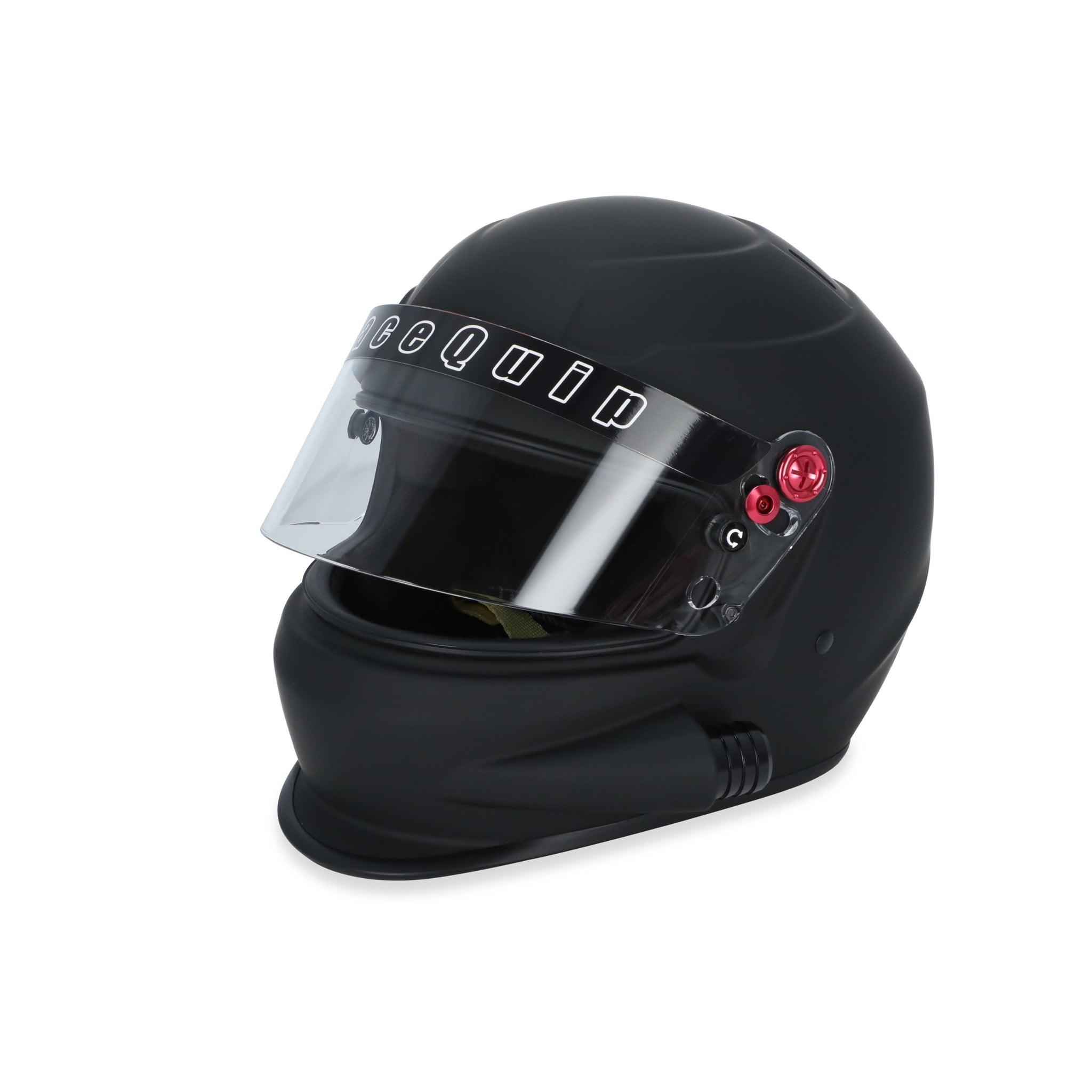 The RaceQuip PRO20 Side Air is a Snell SA2020 rated full face auto racing helmet that incorporates contemporary styling with modern production techniques. These helmets are also sometimes called forced air, blower, or pumper helmets because they have a provision on the helmet to attach a fresh air hose. The shell is built using composite materials placed into pressurized steel molds to achieve the best combination of light weight and strength. Reinforced M6 threaded HANS/HNR inserts are mated to the shell along with an expanded polystyrene (EPS) liner. HANS or other Head and Neck Restraint device anchor posts (not included) can be easily attached to the outside of the helmet using the installed M6 threaded inserts. Forced air is plumbed into the left side of the helmet through a standard 1.250" barbed fitting so air flows across the face shield from left to right for cooling and anti-fogging. The distortion free 3mm polycarbonate face shield features a red anodized aluminum pivot kit, hand ratcheting Tear Off posts, and a silicone eye port gasket to seal out dust and dirt. A wide eye port provides good peripheral vision and allows the use of personal eyewear. The Snell SA rating means that the Nomex interior and paint are fire retardant as well as the Kevlar chin strap. NOTE: This helmet is Snell SA2020-certified and is broadly accepted by race organizing bodies and tracks through 2030. Always verify safety rules with your sanctioning body.