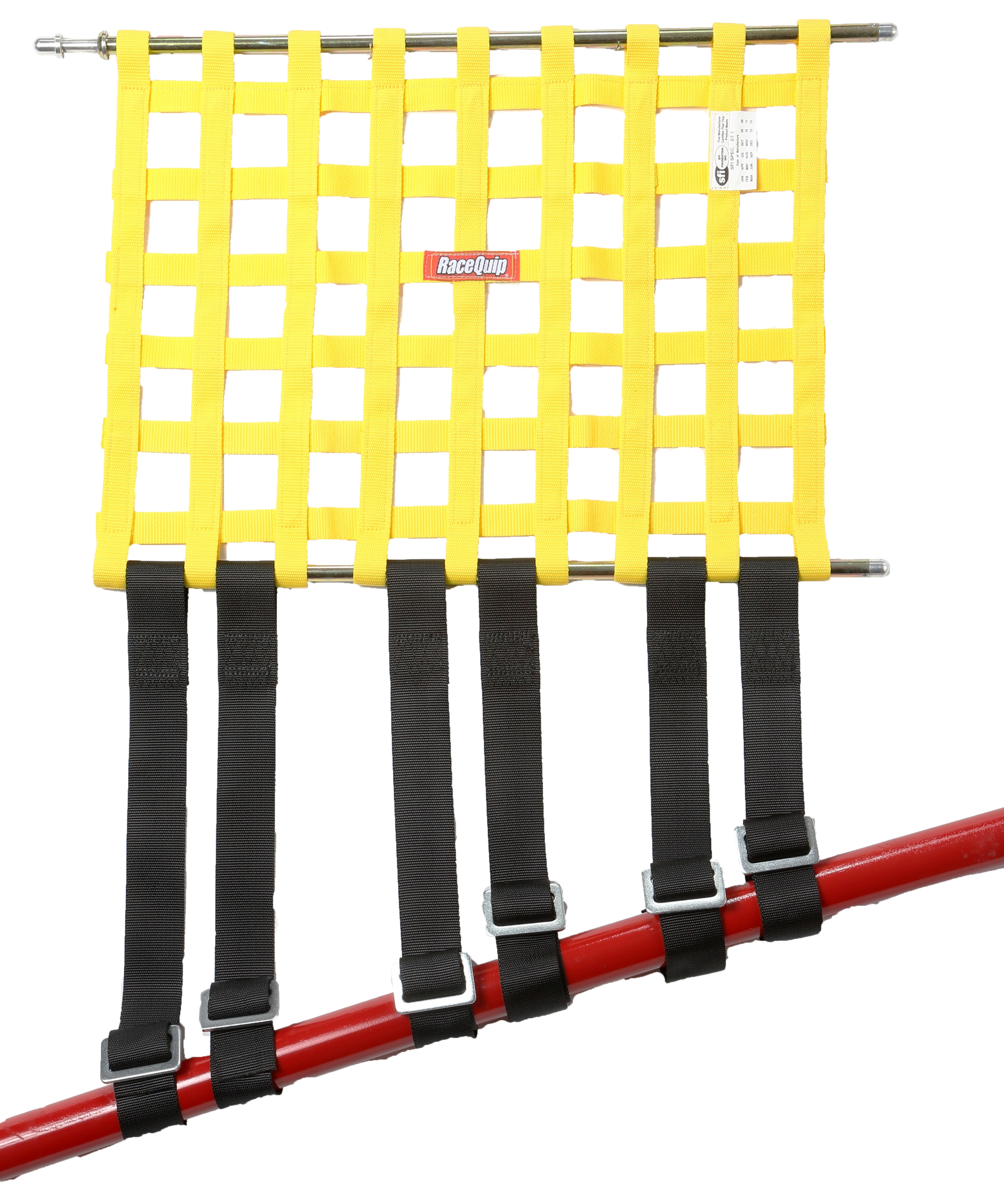 This RaceQuip Window Net Bottom Bar Attachment Kit features an unique way to secure the driver's side window net in a racecar. This kit consists of six drop forged 3 bar slides and six 1.5" wide nylon straps with loops at the top. This "strap on" kit allows you to mount your bottom window net bar to a door bar in the racecar chassis. You install the straps on the bottom bar of the window net mount kit, and then determine the length you need to wrap around a rollbar in the door. You then adjust the length of the straps and then loop them around the bar and lock them in place with the 3 bar slides. It is recommended to use all six straps to replicate the strength of the window net itself. Sold as one complete kit.