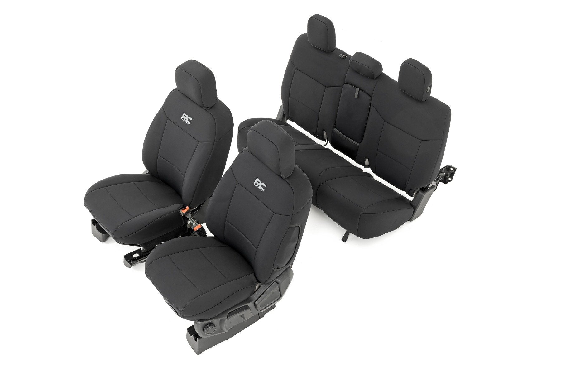 Want to protect your seats or are your seats showing signs of wear and tear from daily use? Say goodbye to unsightly stains and deterioration with Rough Country's Neoprene Seat Covers - the ultimate solution for preserving your vehicle's interior.Snug Fit for Optimal Protection: Our seat covers are tailored to fit your seats perfectly, providing a protective barrier against spills, scratches, and everyday wear and tear.Factory-Spec Construction: Engineered to meet factory specifications, our covers blend seamlessly with your vehicle's interior, giving it a fresh, new look without compromising on quality or style.Four-Layer Defense: With a four-layer construction featuring foam padding and a durable polyester shell, our seat covers offer unmatched protection and longevity, ensuring your seats stay looking new for years to come.Breathable and Water-Resistant: The neoprene layer not only provides breathability for added comfort but also boasts water-resistant properties, safeguarding your seats from spills and stains.Complete Coverage: Our covers come with full protection for your front seats, including headrest covers where applicable, as well as rear covers to shield your back seats from children and pet-related mishaps.Peace of Mind Warranty: Rest easy knowing your purchase is backed by our two-year warranty, giving you confidence in the durability and reliability of our product.Don't let worn-out seats diminish your driving experience. Upgrade to Neoprene Seat Covers today and enjoy a fresh, stylish interior that's protected against the rigors of daily life on the road.