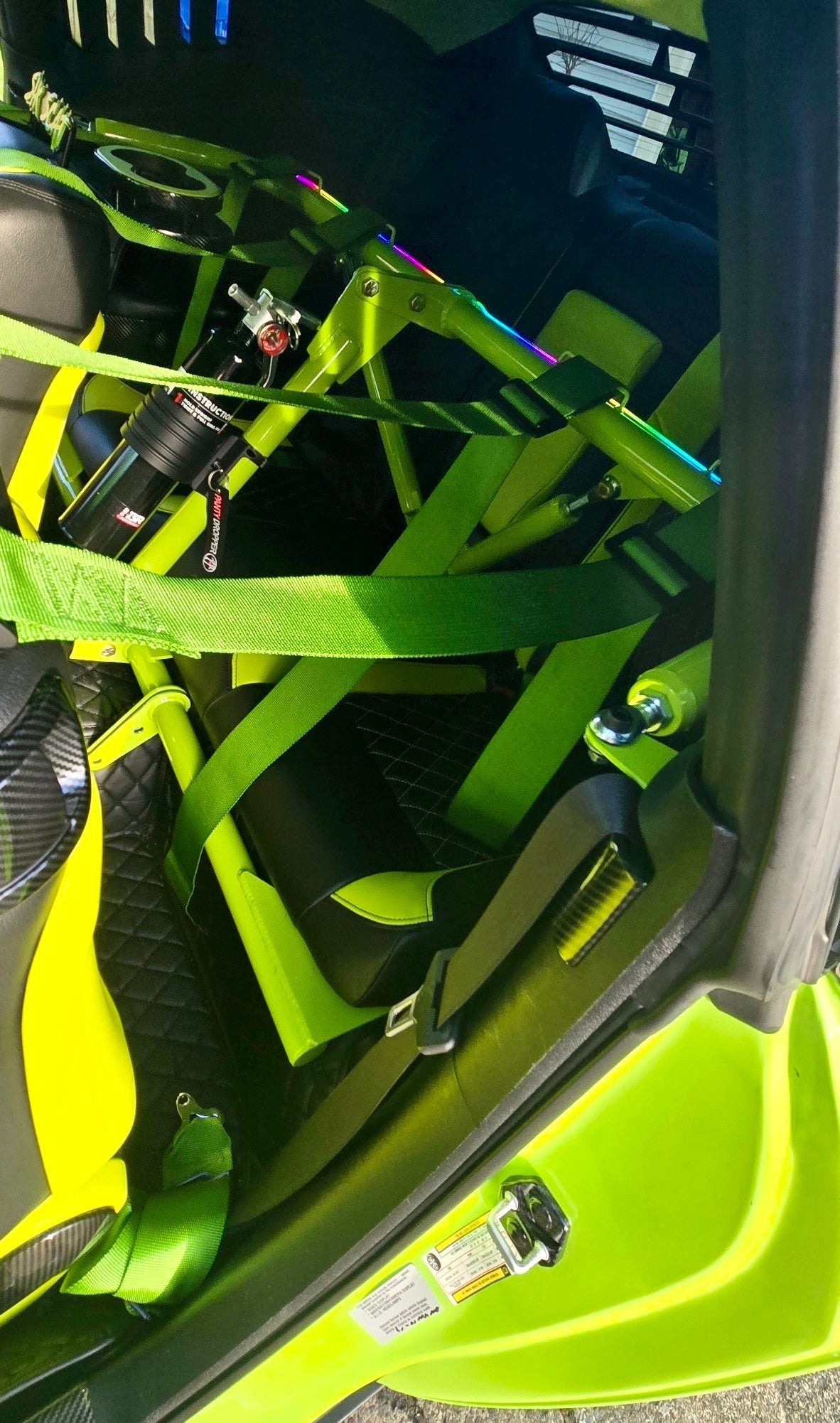 Optional: Add our 4-point cam-lock elite racing harness belts with 3" wide webbing, bolt-in lap belts, and bolt-in or wrap-around pull down shoulder belts. (It comes with the bolt-in clip or you can remove it to install wrapped around your harness bar.) Black hardware. Your choice of belt webbing color. Color sample video: https://youtube.com/shorts/7WBGcTJzCPs