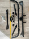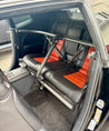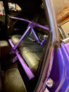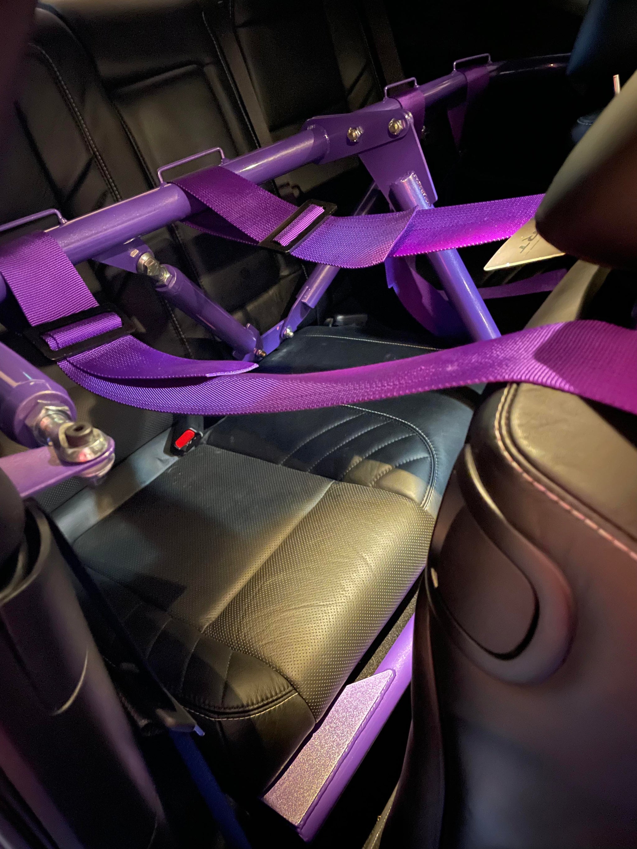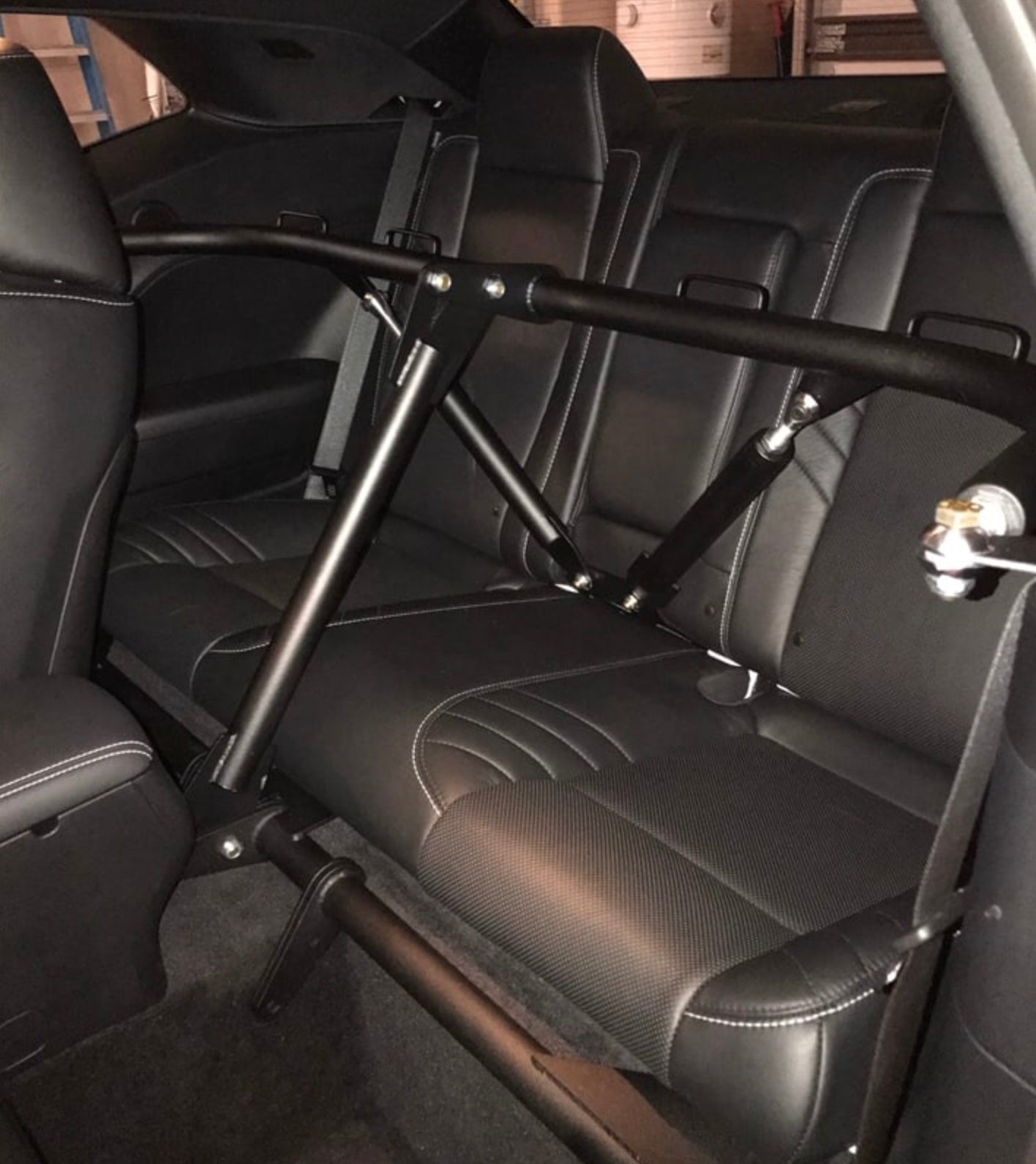 Our Challenger harness bar is bolt-in, with no cutting or altering the interior required. The harness bar utilizes existing locations within the Challenger for mounting. It fits with the back seat in place or with one of our rear seat delete kits. The main hoop and down tubes can be quickly and easily removed to allow full access and use of the back seat, if desired.